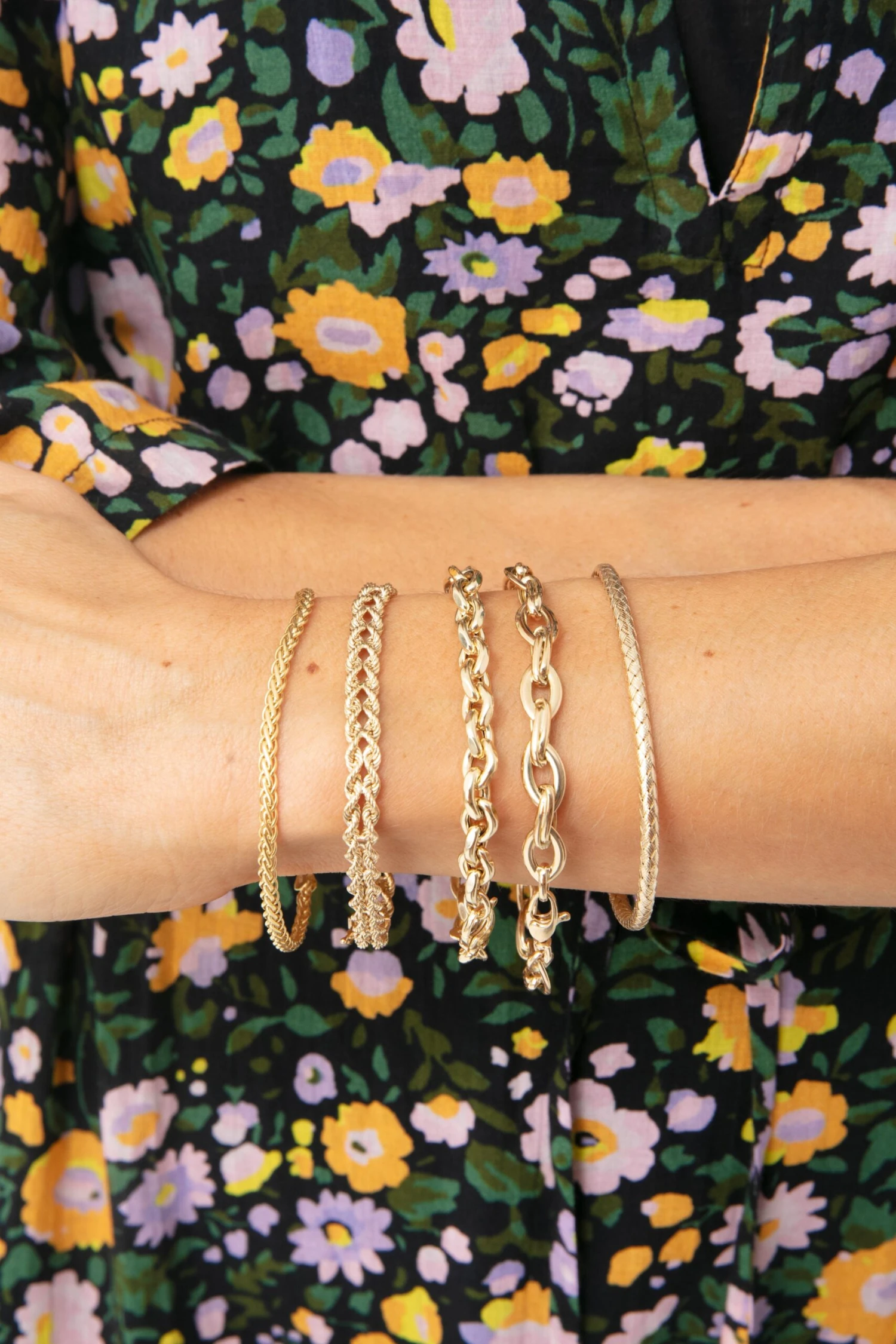 The shine of yellow gold and intricate weaving adds contrast to a classic bangel bracelet!