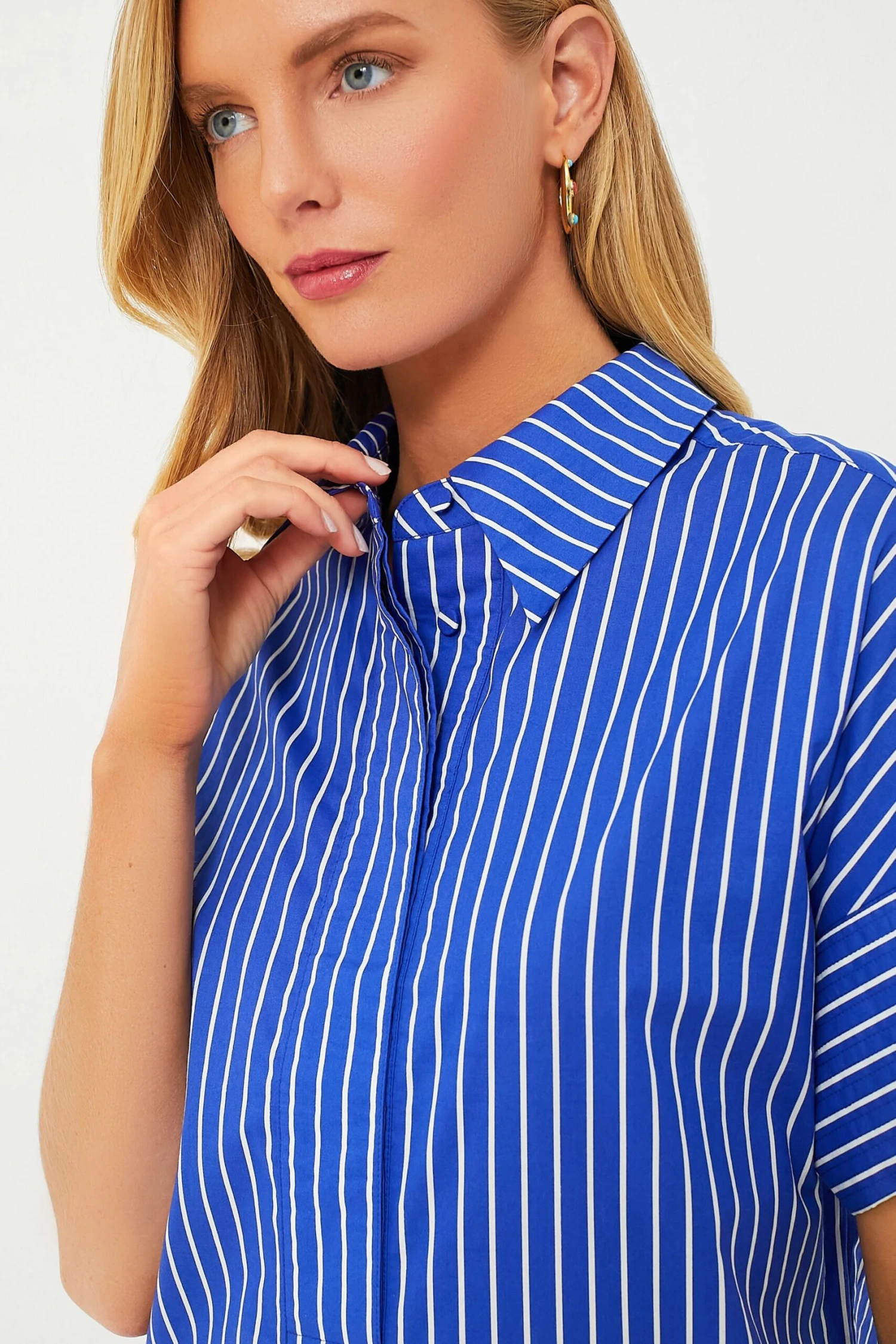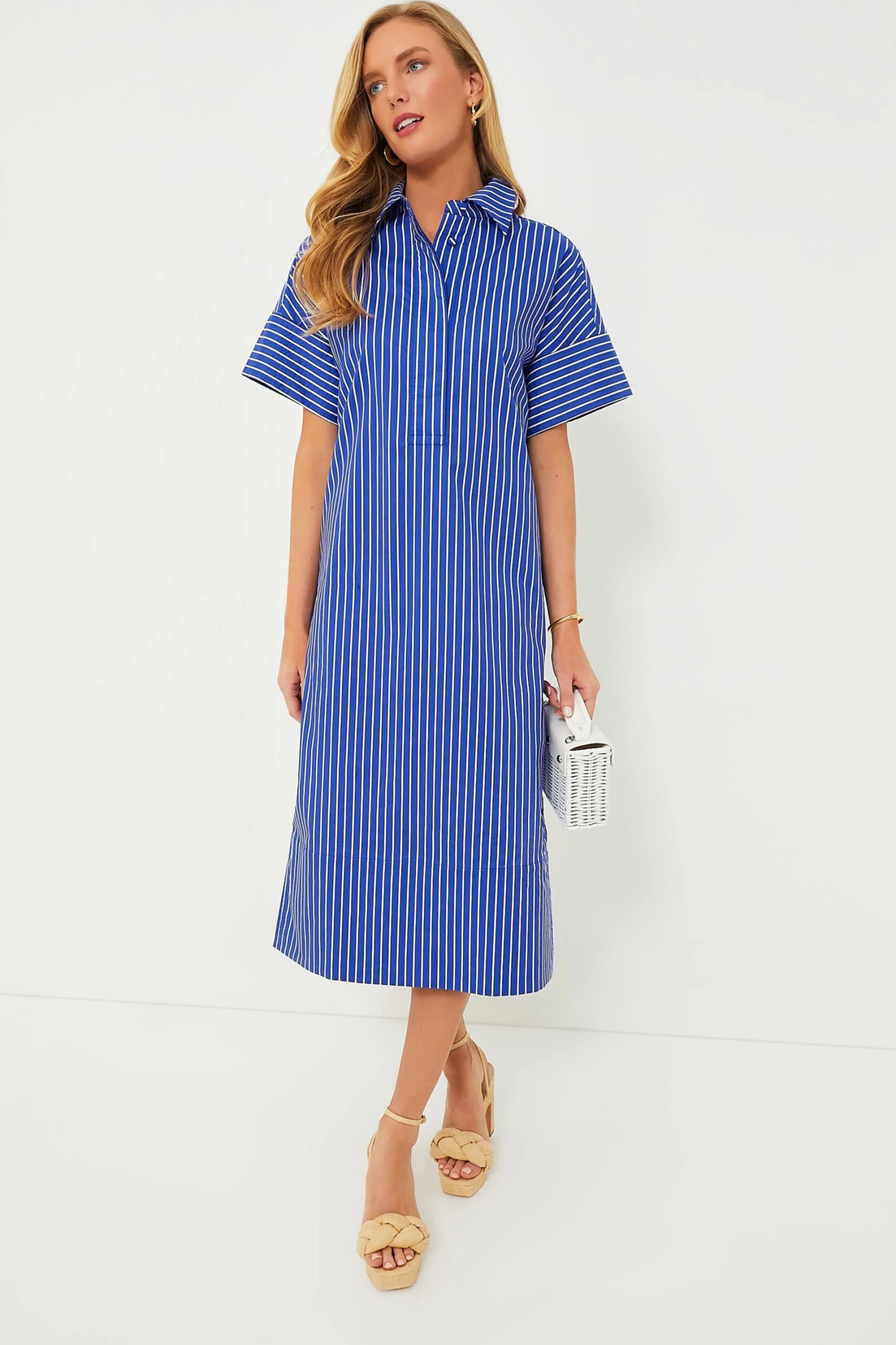 Introducing the Baleine Stripe Reina Dress — an ultra-flattering midi shirt dress. This column silhouette features short sleeves with contrast cuffs, side slits, and a front button placket with self-covered buttons. An easy style that can be dressed up or dressed down, simply add sneakers and a tote for a day of errands or heels and gold hoops for a dinnertime look.Â