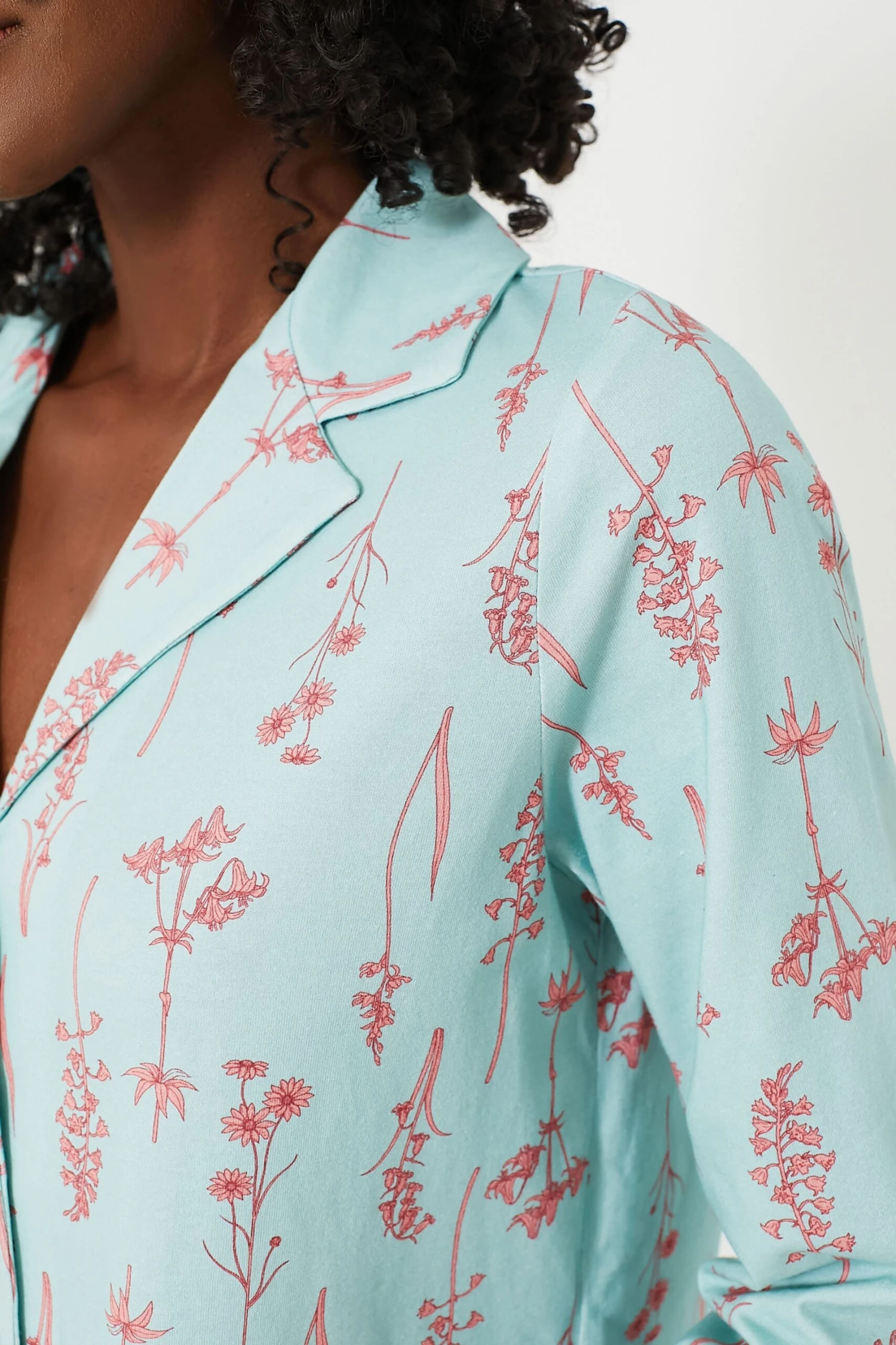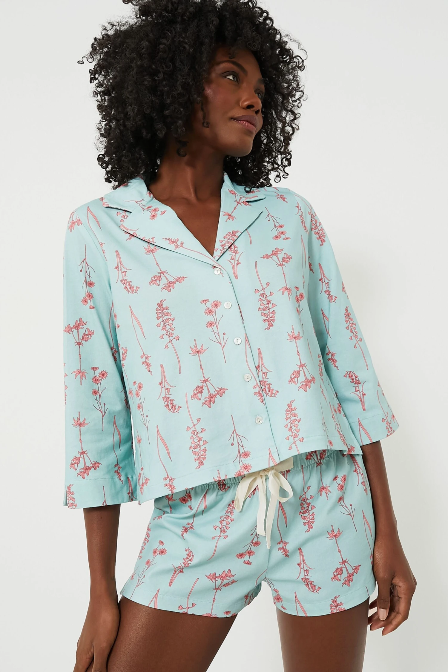 Drift off to dreamland knowing you look cute with the Beatrix Short Pajama Set. Printed with a pink herb motif on a subtle turquoise background, this style is crafted from the best quality cotton jersey that is thermal regulated and adapts to all seasons. A roomy shape, flexible elastic waist, small slits on the sides, – these pajamas are a no brainer!  Â