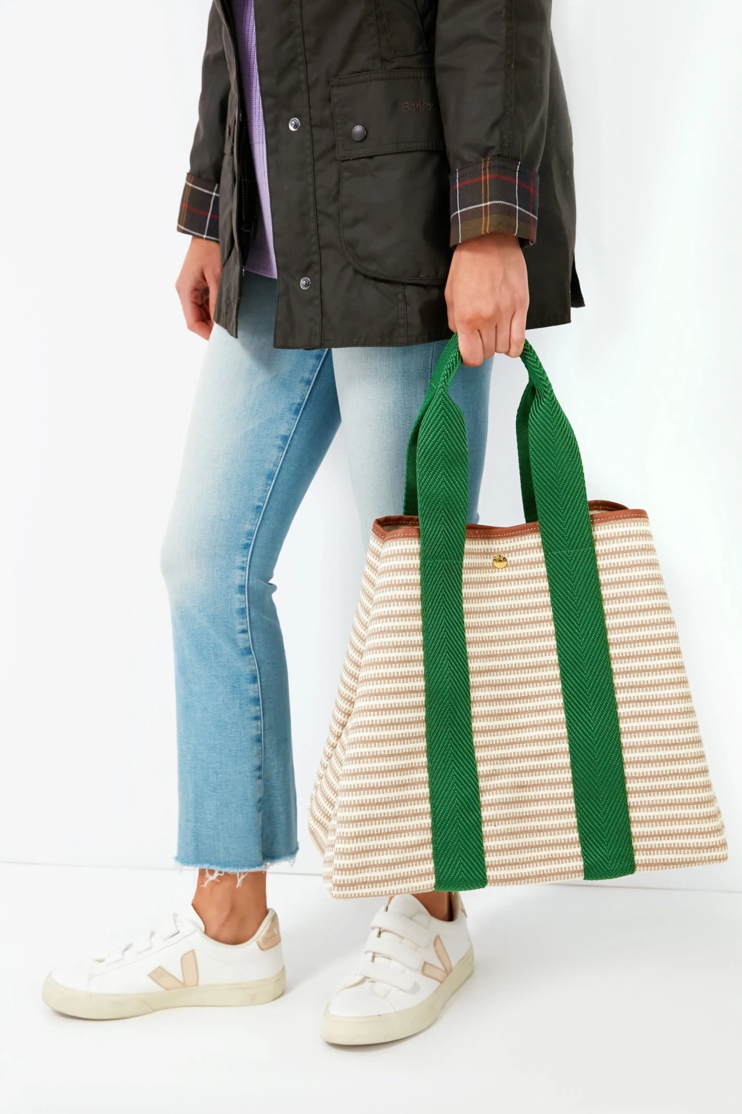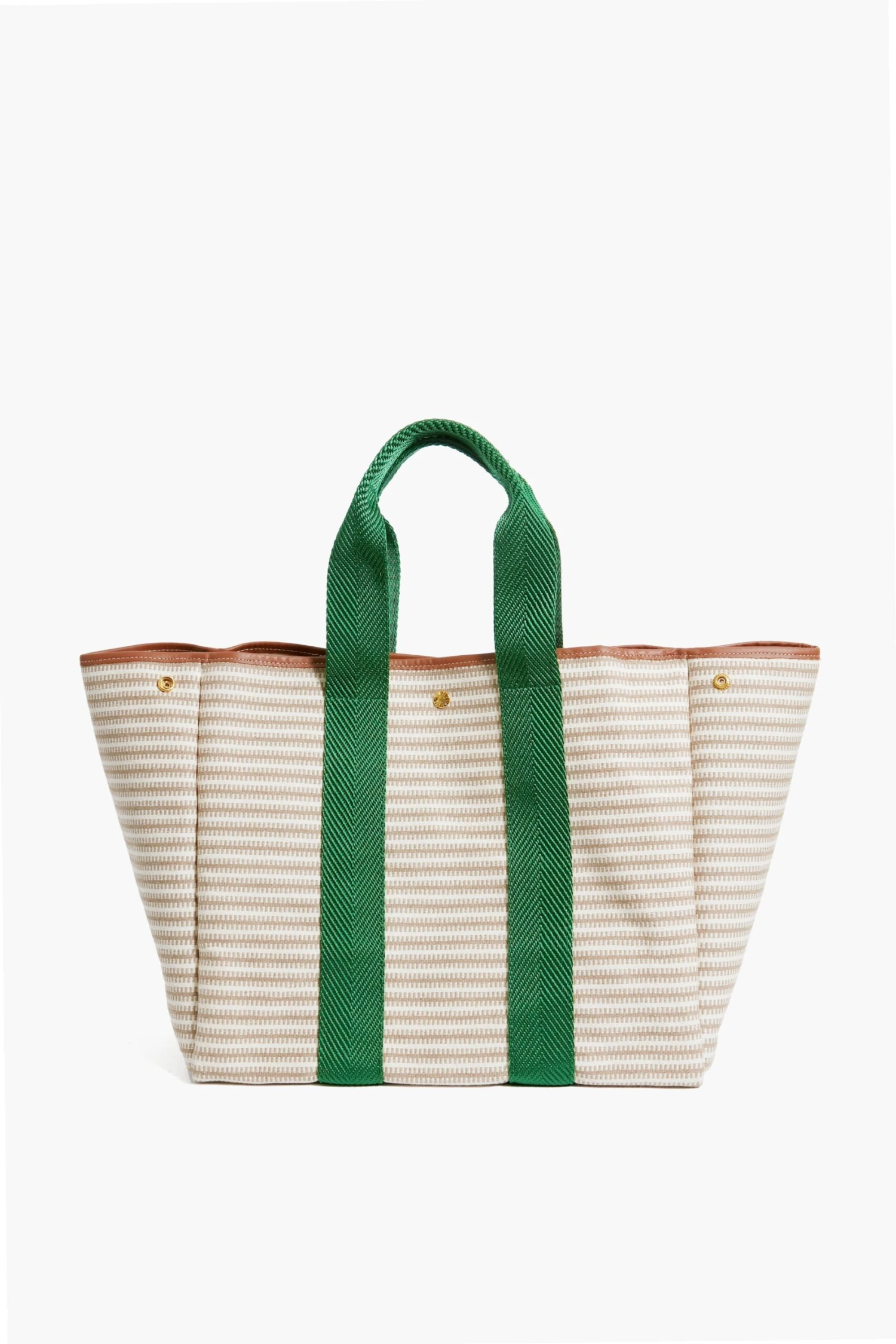 The Beige Traversee L Zip Tote provides all of the space and style you need for an everyday work bag or for an upcoming weekend trip. Crafted with thoughtful details like sturdy yet chic contrast green top handles and snaps on each side that allow you to switch up the shape and size for those days when you need a little extra room. This striped bag is a game-changer and will make bustling around just that much easier.