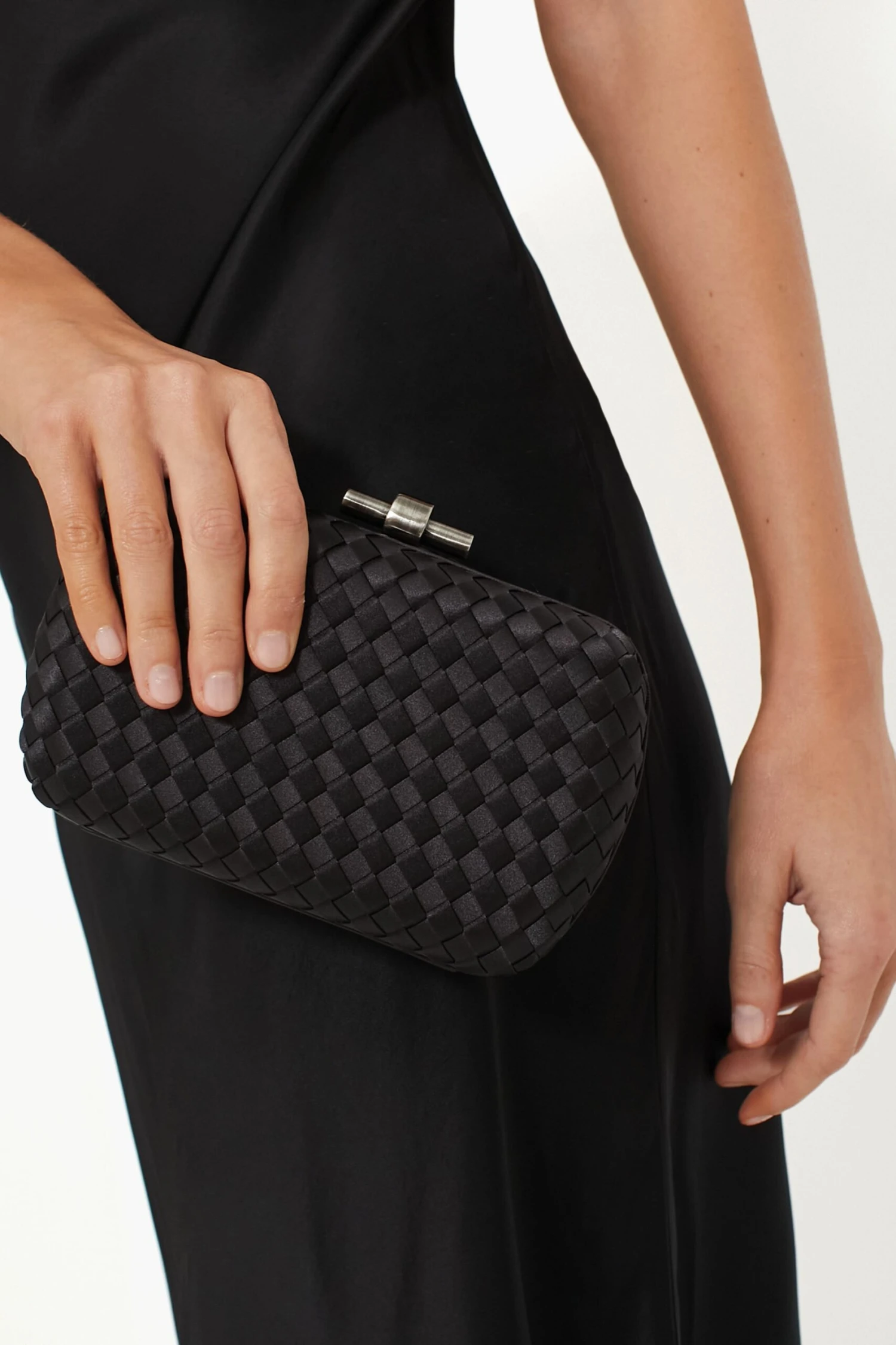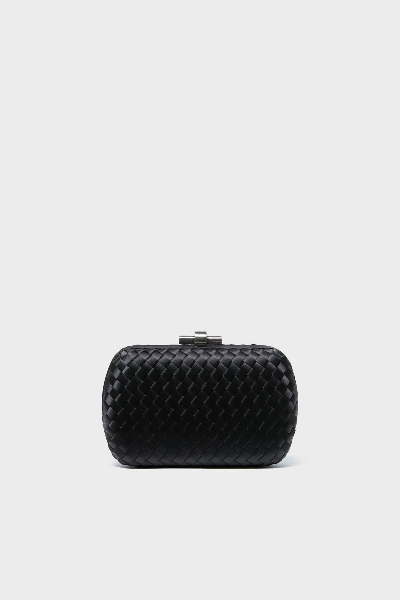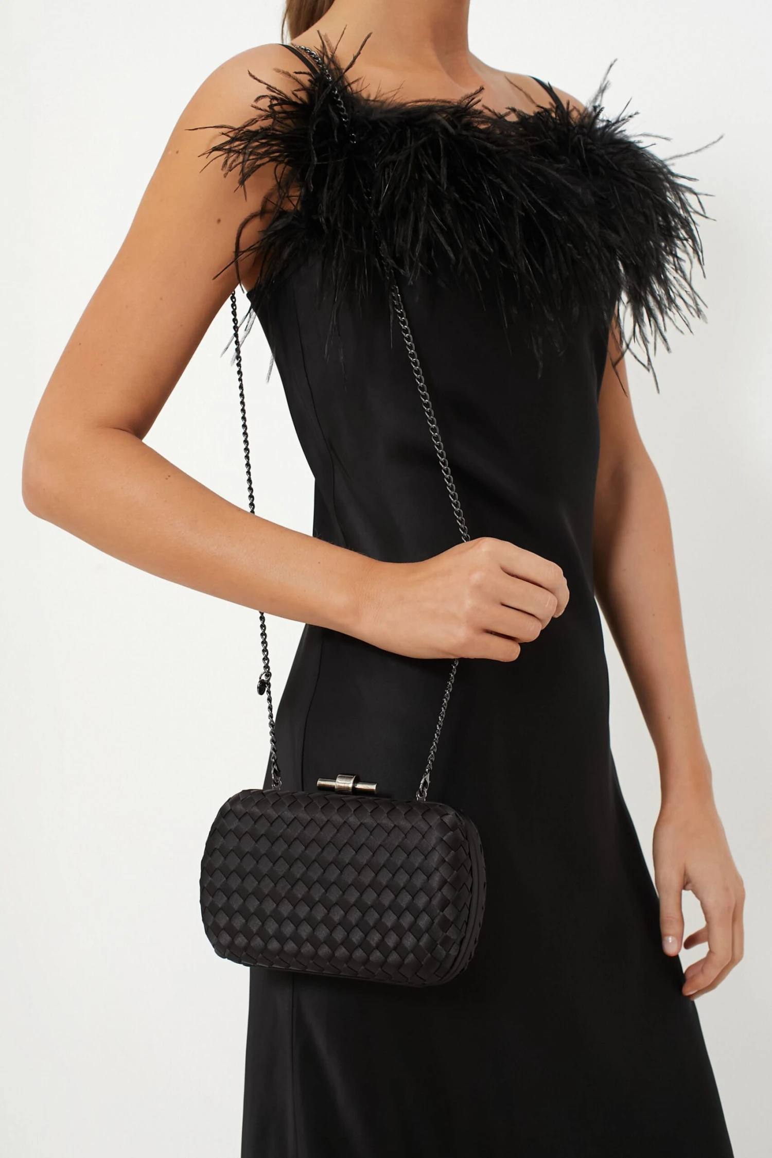 The Evelyn Woven Clutch is the perfect blend of luxury and function. With its intricate woven satin fabric, timeless hard case design, and convenient removable shoulder chain, this black satin bag is the ideal accessory for any special occasion. Create a beautiful statement with timeless elegance.