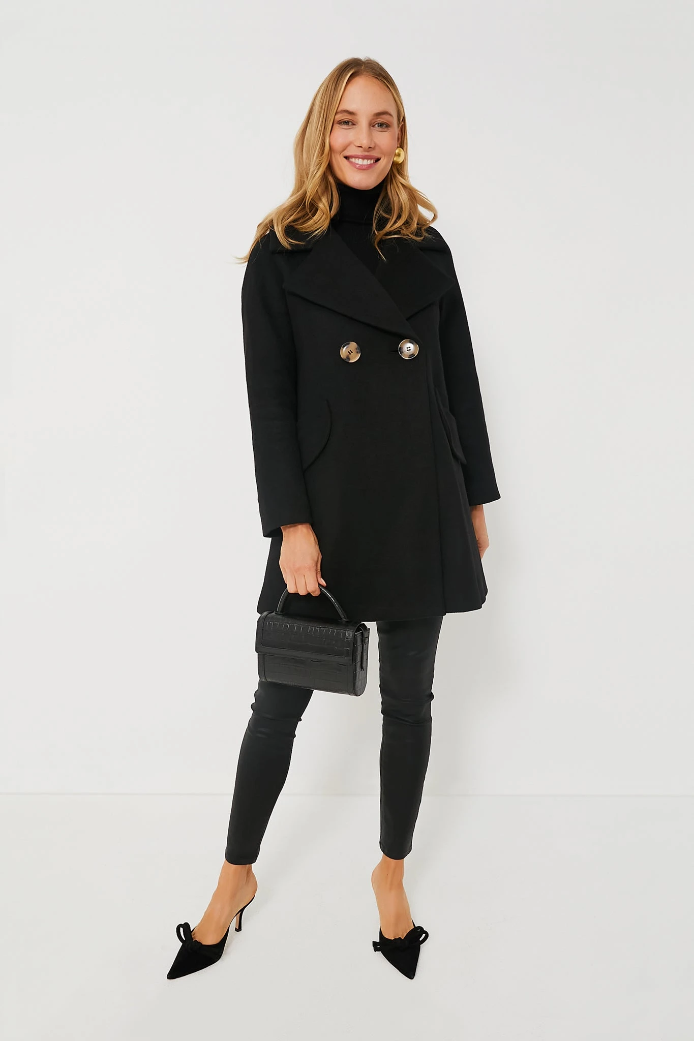 There is no piece of outerwear quite as chic and timeless as the Black Harley Peacoat. In a neutral colorway that goes with everything from dresses to denim to daring party silhouettes, you’re sure to get plenty of use out of this perfect piece. Complete with deliberate details like notched lapels, oversized tortoiseshell buttons, and angled flap pockets at the hips for extra functionality, this deserves a place in your cold weather wardrobe without a doubt!
