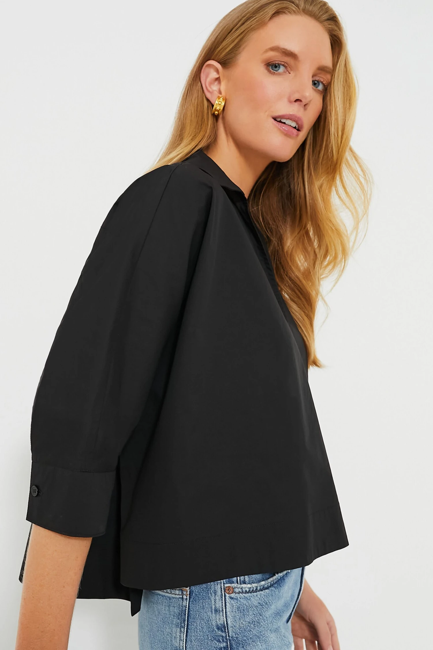 Classic, sleek, and effortless, the Black Polo Popover is the easy style that we know will live in your closet for years to come. Featuring a slightly cropped boxy silhouette, flattering collared V-neck, and three-quarter length batwing sleeves, this sophisticated number is perfect for an elevated daytime look or for cocktail hour. We are pairing it with denim of all colors and flats for year round styling.