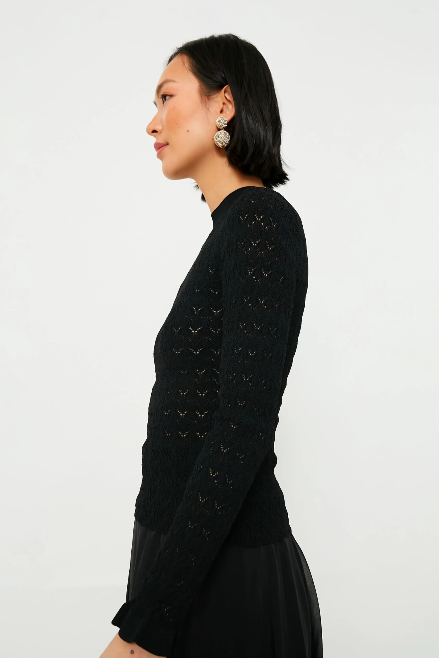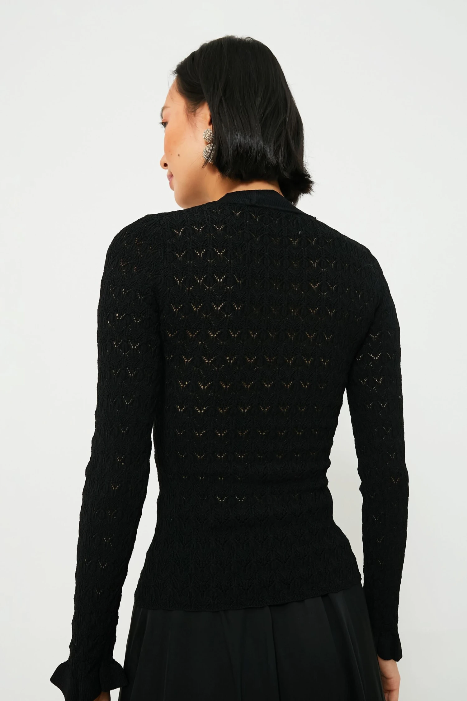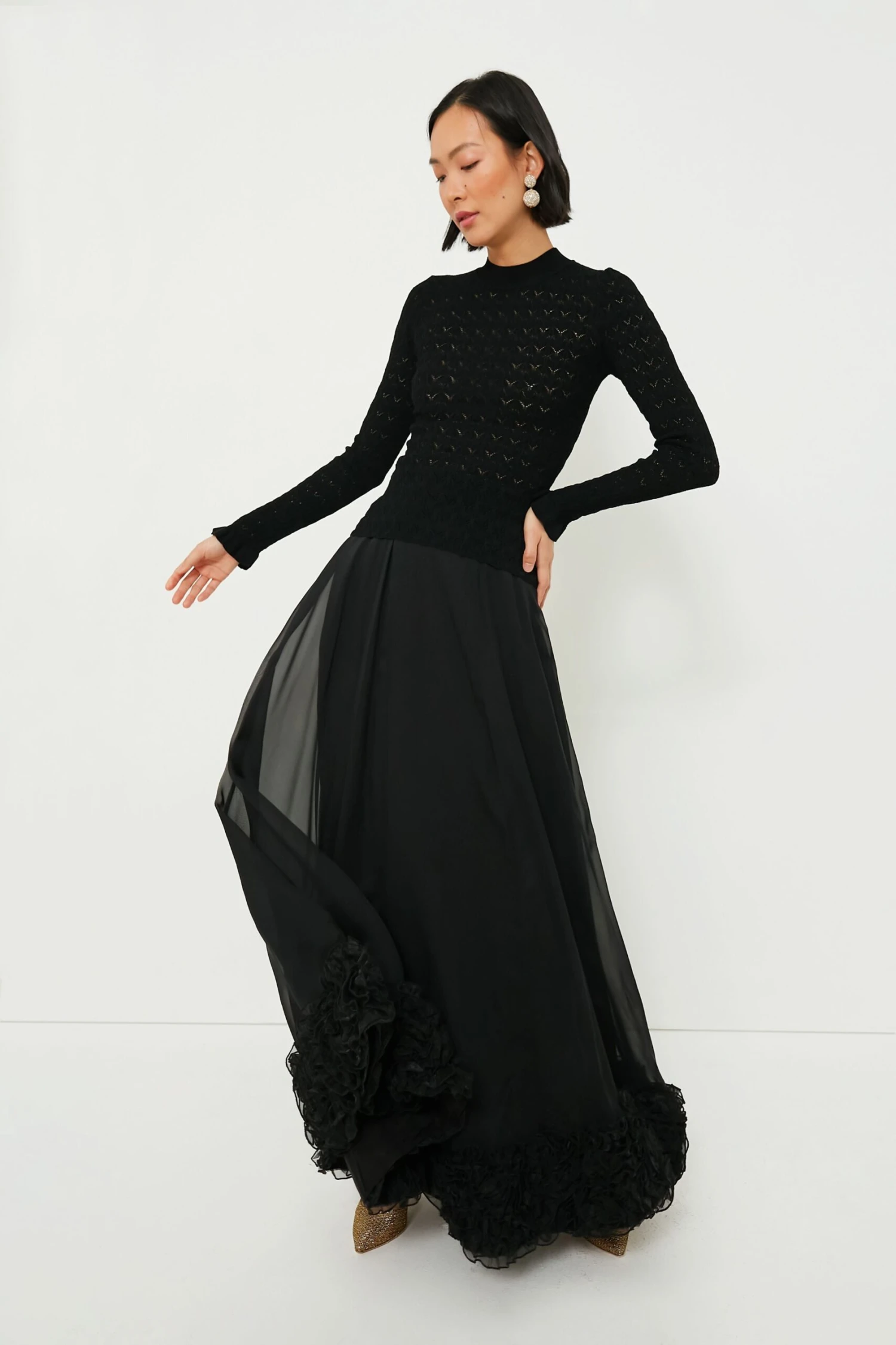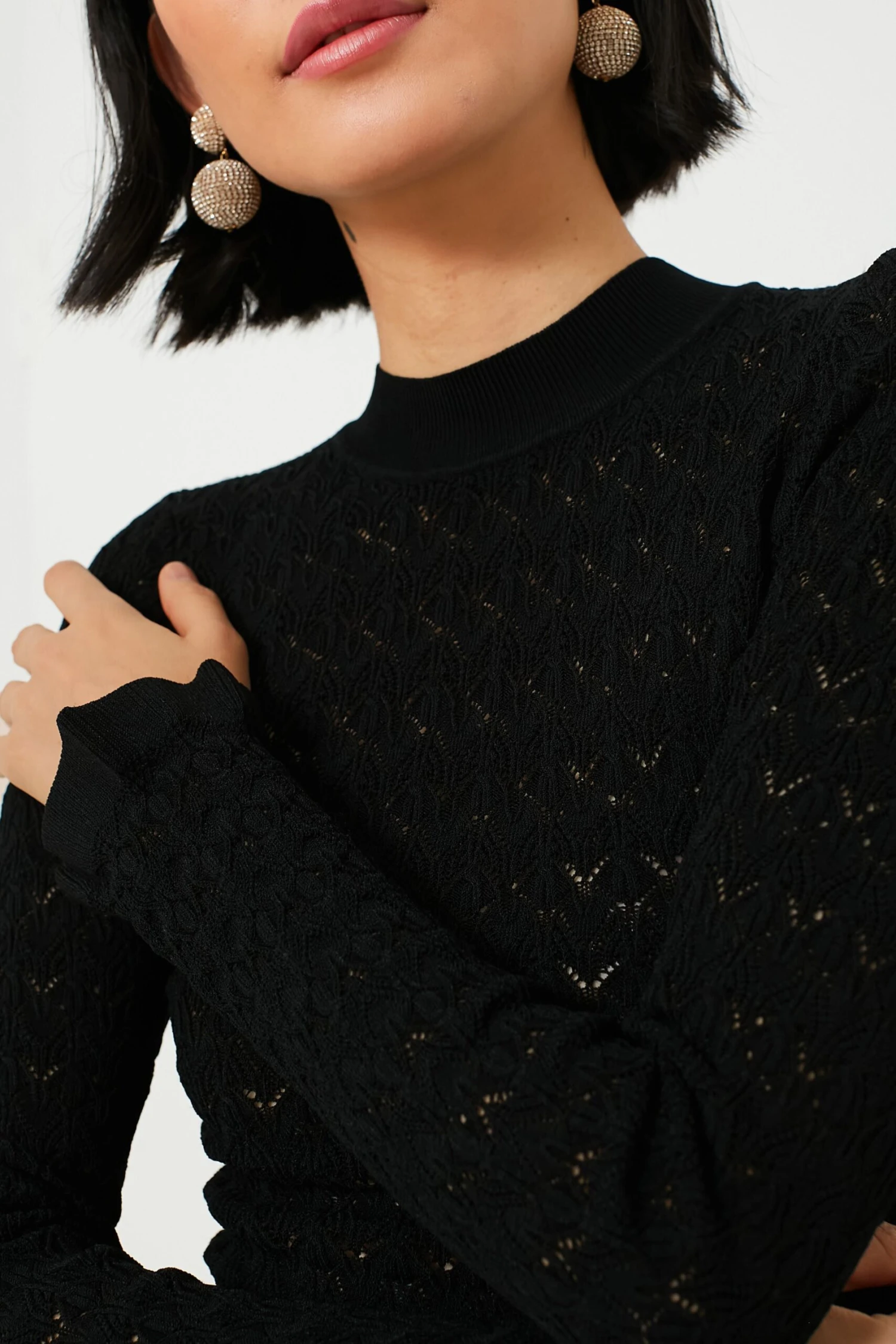 The Black Rue Fine Knit Gauge High Neck Sweater is perfect for wearing on its own or layering under sweaters and jackets. Complete with a high neckline, ruffle cuffs, and a slightly sheer knit design, this top is delicate and feminine. Pair with a mini skirt and boots or with denim and flats for the perfect balletic outfit.Â