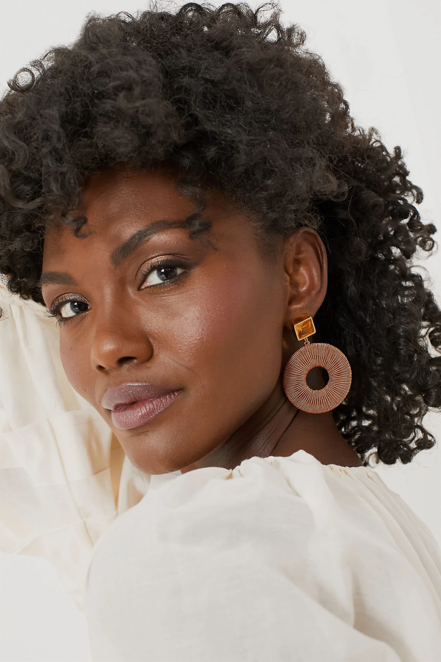 From the beach to the bar, and everywhere in between you’re sure to impress when you wear the Brown Palmier Earrings! Set in gold-plated brass, this gorgeous drop silhouette boasts oversized light brown silk cord-wrapped hoops hanging from faceted lemon quartz square tops. Style them with a sleek updo and a cocktail dress for a dazzling evening or let them be the focal point of your casual attire by pairing them with a white button-down and jeans.