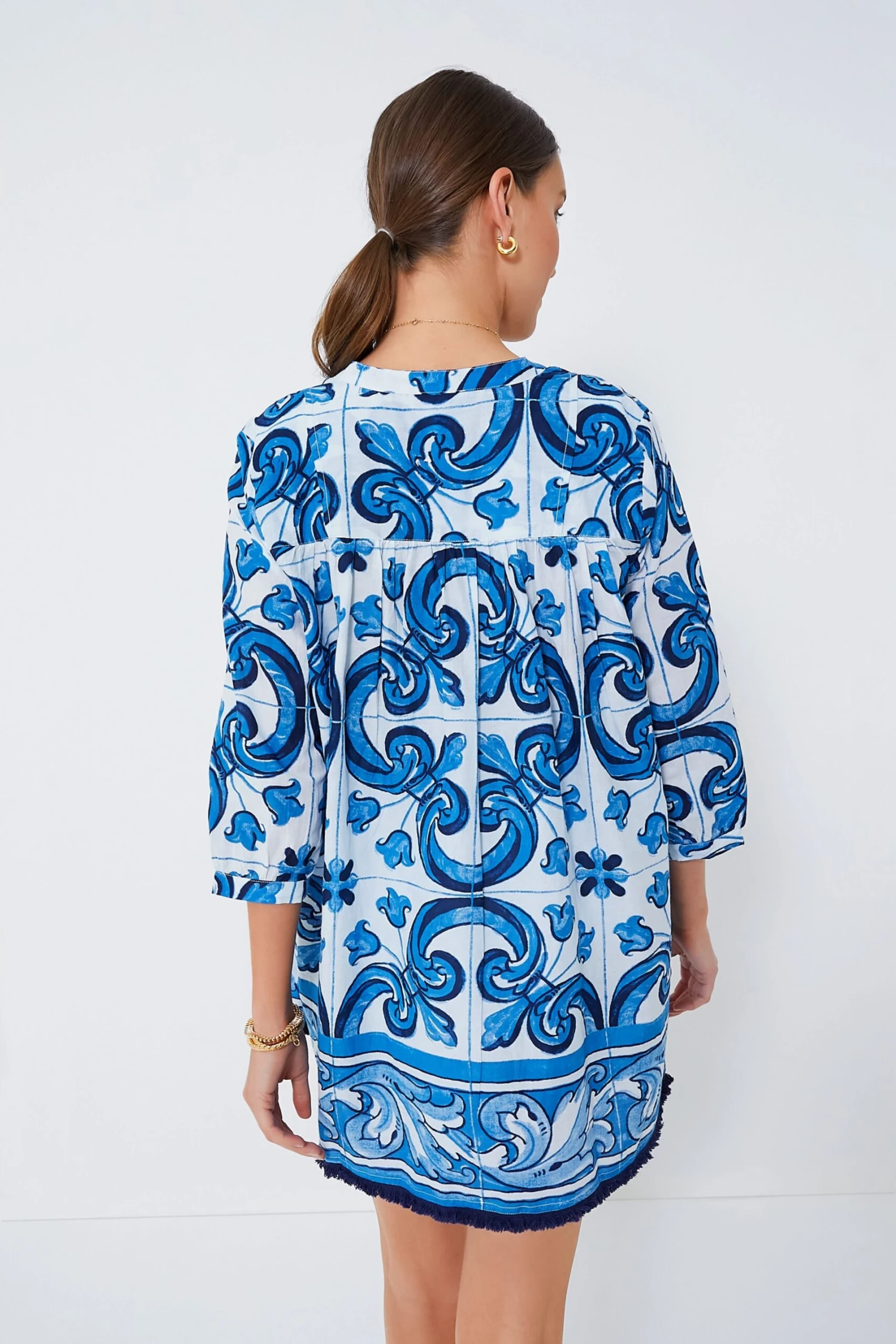 Vibrant colors meets casual coolness with the Capri Blue Majolica Tile Bondi Coverup. Various hues of blue make up the geometric design that decorates the body and is neatly accented by navy fringe along the hem and corded tassel neckties that allow you wear this style open or done in a bow. With three-quarter length sleeves to keep you protected from the sun but won’t leave you overheated and a flirty mini length for a breezy feel, we are wearing this everywhere from backyard pool parties to sailing the high seas, just grab a pair of sandals and sunnies are you’re all set.Â