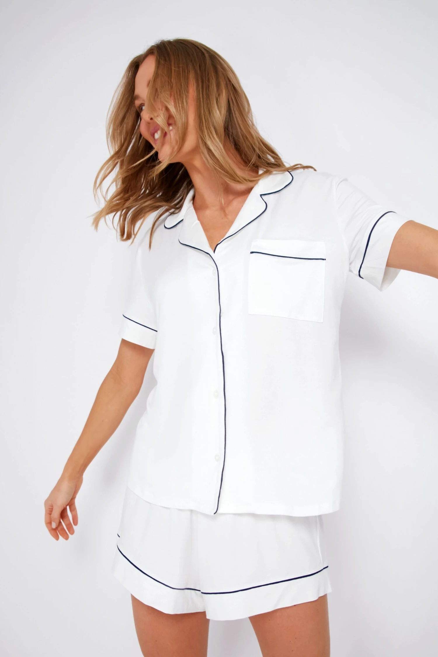 Does anything feel better than cozying up in a chic PJ set? The Ivory and Navy Gisele Short Sleeve PJ Set merges classic silhouettes with sustainable TENCEL™ Modal fibers for the perfect relaxed fit. Cut from luxurious, temperature-regulating knit fabric that drapes and falls in all the right ways, your body will be enveloped in comfort from the second you put these on. Plus, it’s machine washable and gentle on the skin, so it not only feels beautiful but it’s easy to care for too. A roomy shape, extra coverage, and the most cozy fit that you can wear and gift with confidence– these pajamas are a no brainer!