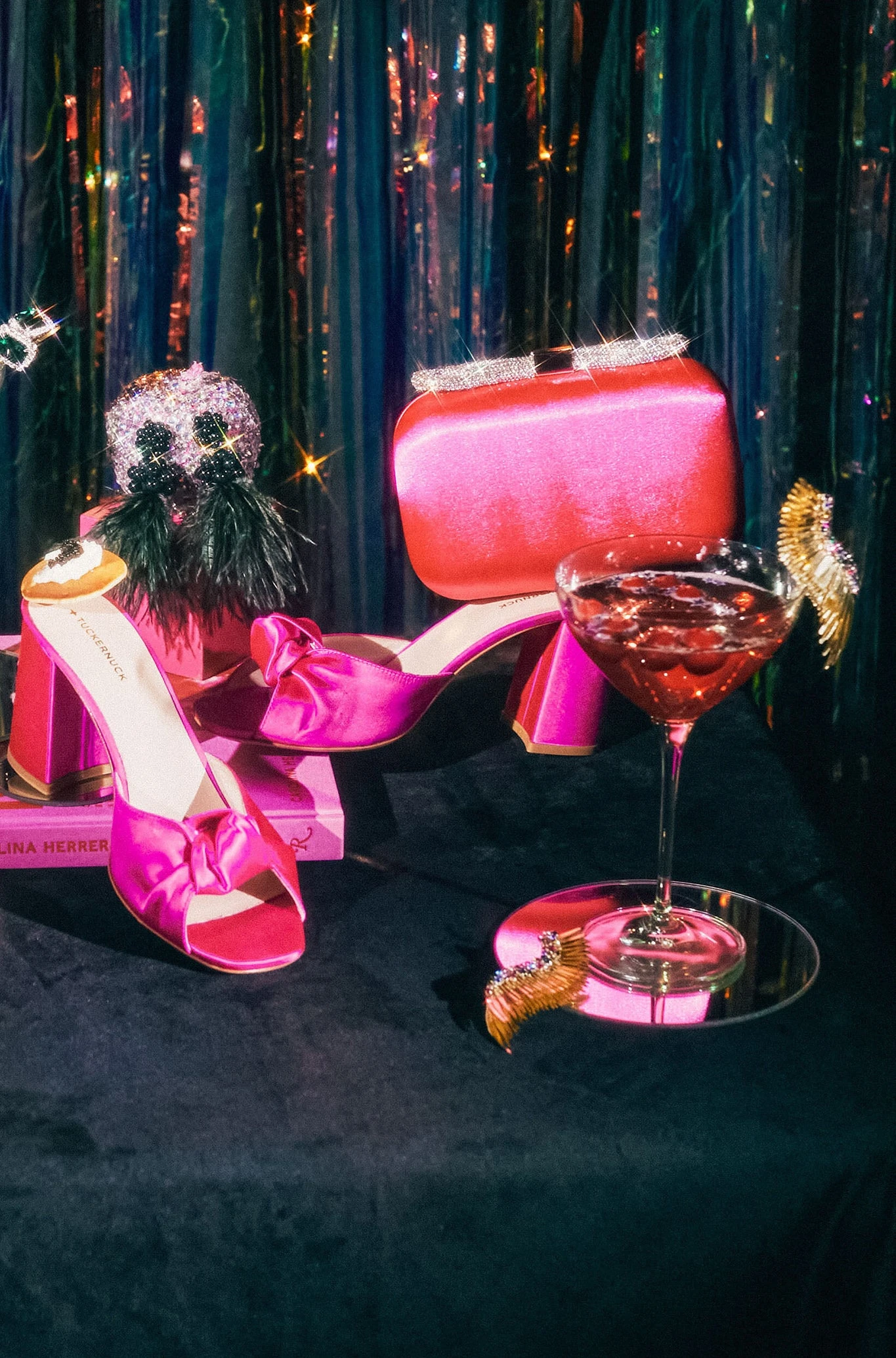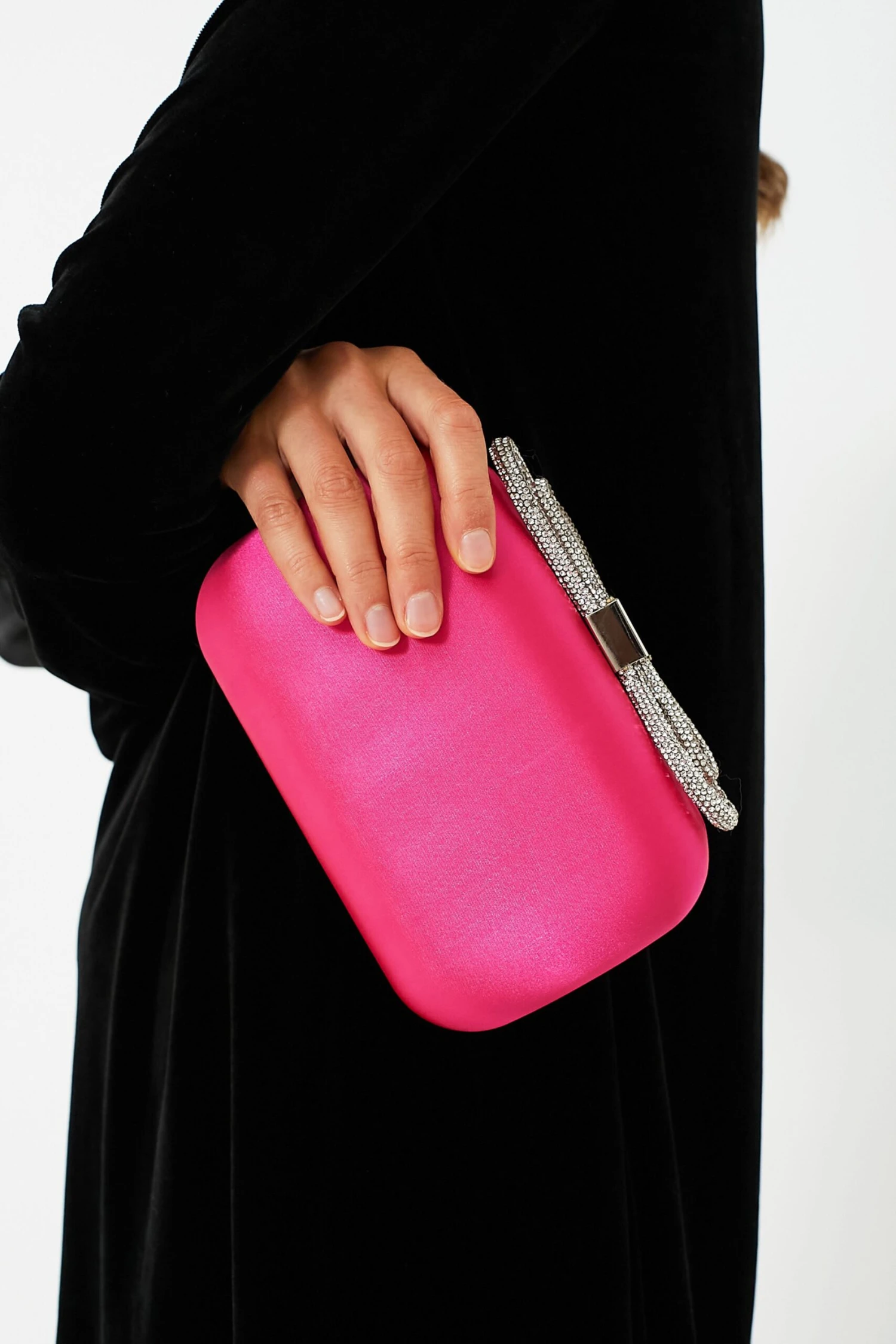 The Fuchsia Ada Clutch is a red carpet show stopper. It boasts a crystal embellished bow lock that is super sparkly and the shape fits comfortably in the palm of your hand. Tuck in the shoulder chain and style it for any formal event or wear it as a shoulder bag when you need to go hands free.