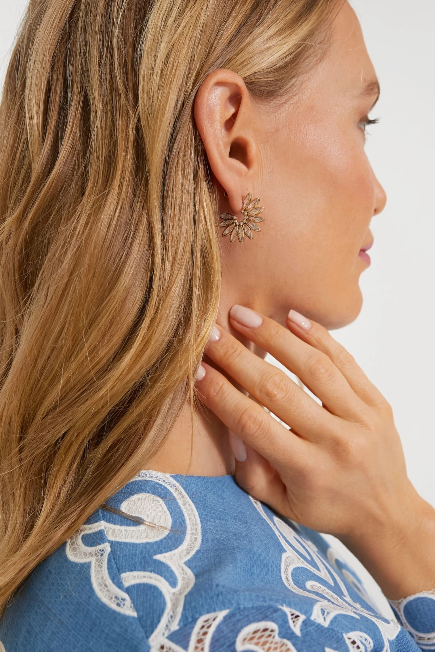Encrusted with light-reflecting crystals, the modern and simplistic Ines Earrings were designed for easy everyday wear. With a radiant crescent of glimmering stones adorning the classic hoop silhouette, these are the perfect way to add subtle glam to all of your looks — from go-to denim to polished blazers to sleek party-ready mini dresses.