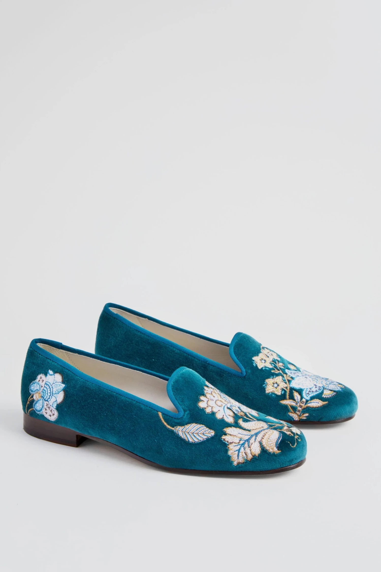 Hand-crafted in Spain from a luxe velvet fabric and adorned with breathtaking embroidery, the Ink Blue Banyan Slippers ensure superior quality forever. We love the grosgrain trim and leather lining on these classic loafers, making them feel ultra-special. Style with denim and a crisp blouse, a sweater dress, and everything in between.