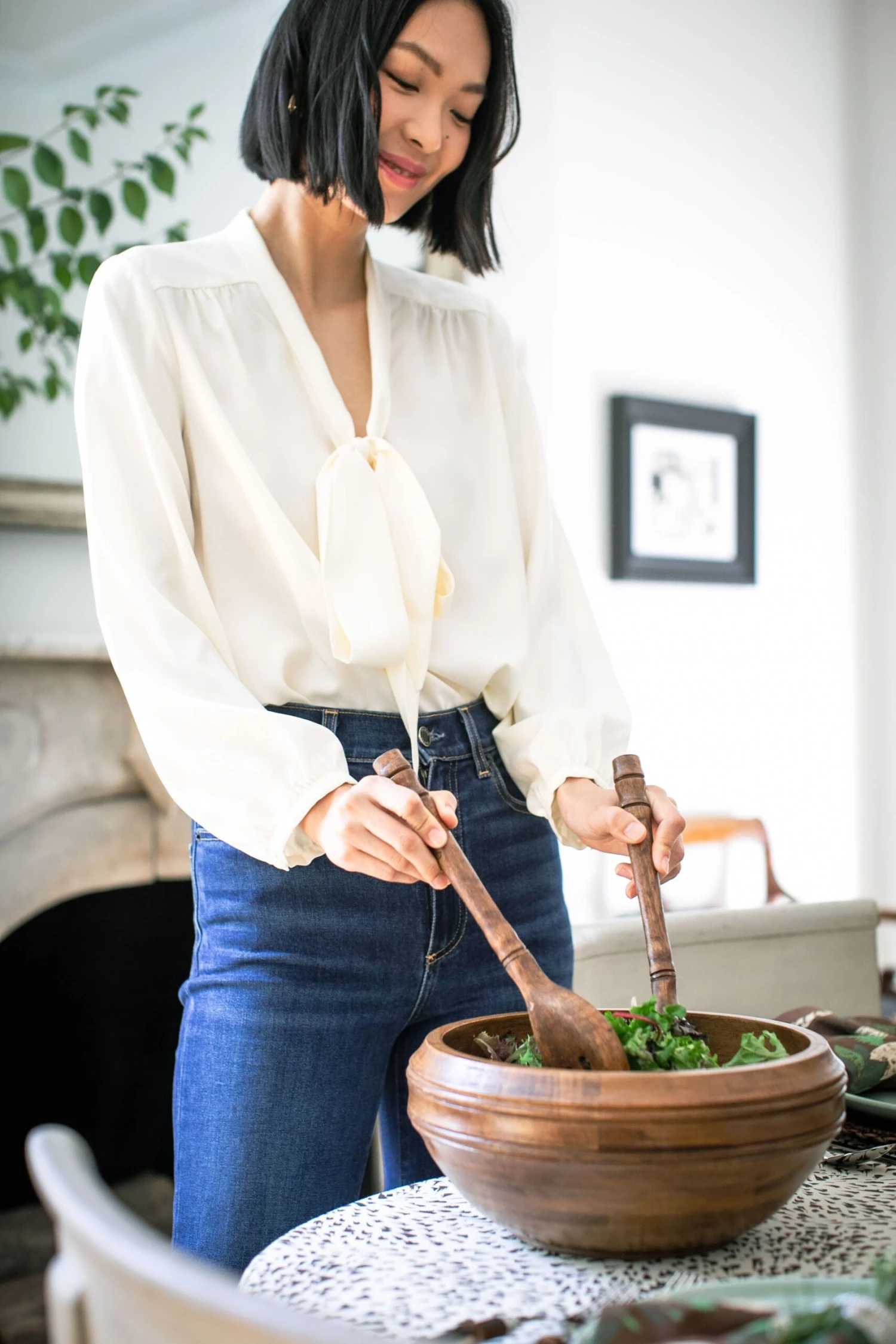 One of our favorite styles for the season, the Ivory Satin Eva Blouse is the epitome of unfussy femininity. Subtle details go a long way on this neutral yet notable style — its deep V-neckline, gathered shoulders, and sweet bow tie give it an extra special touch you’re sure to love. Pair it with flared denim and platform heels for a retro-inspired look, dress it up by layering a blazer on top for your next big meeting, or style with denim and statement earrings for date night!