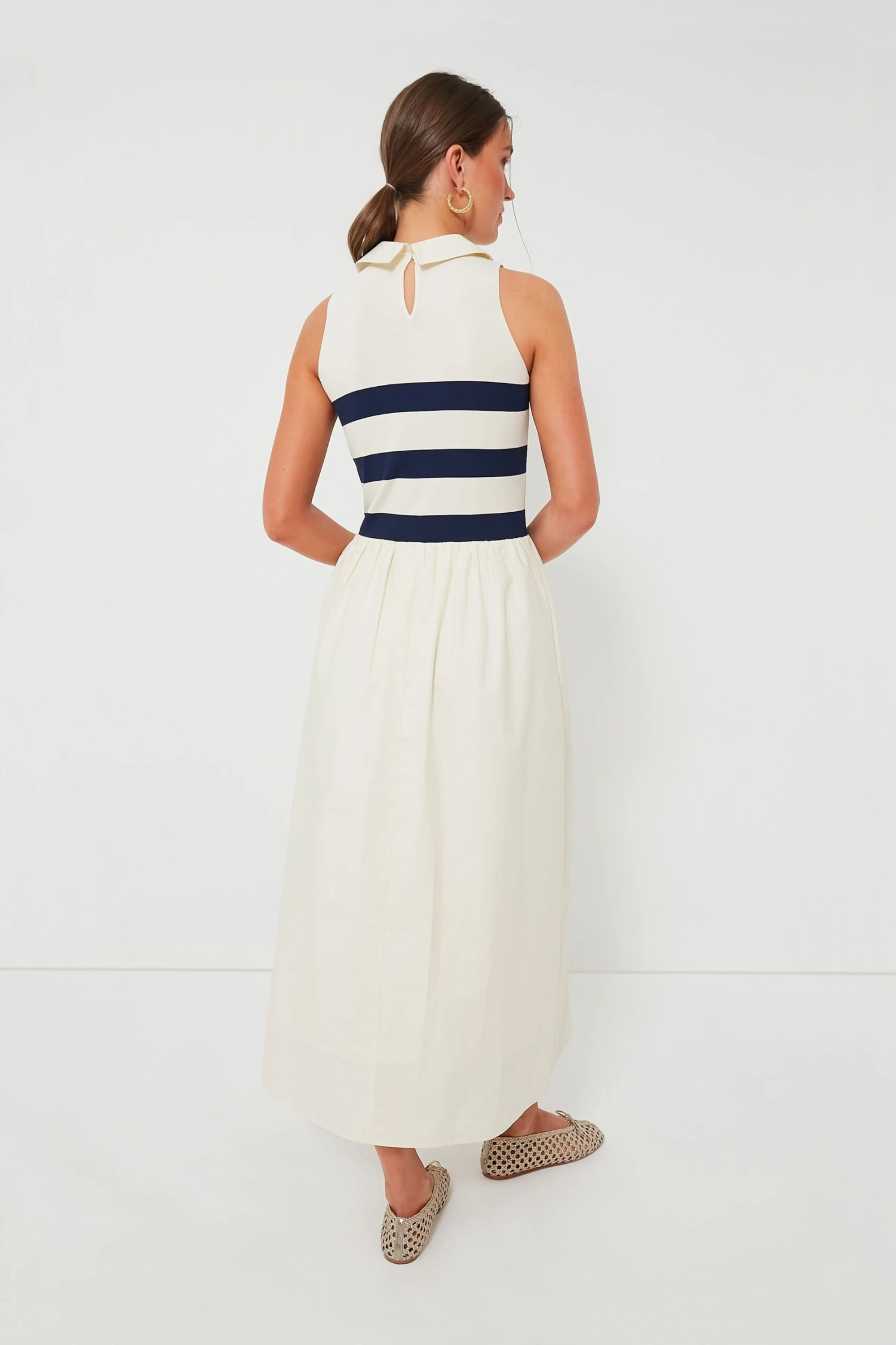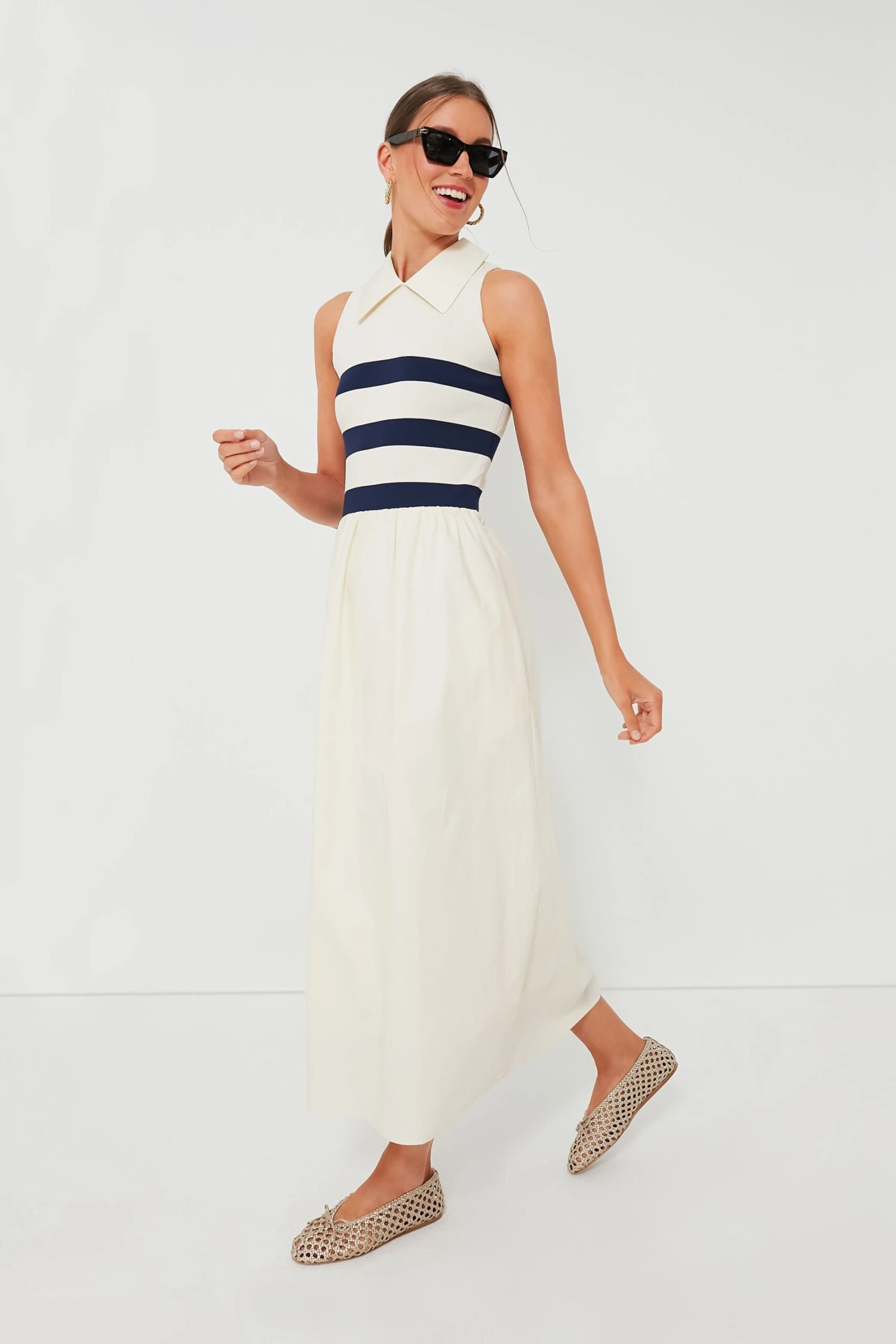 Classic and luxe, the Ivory Stripe Marina Dress mixes a knit top with a lightweight cotton skirt to create an unexpectedly polished piece. This mixed media stunner features a sleeveless bodice and spread collar that effortlessly transitions into a full skirt that’ll hold its shape. Add gold heels and your favorite clutch for an always on-trend dose of Parisian-chic style.Â
