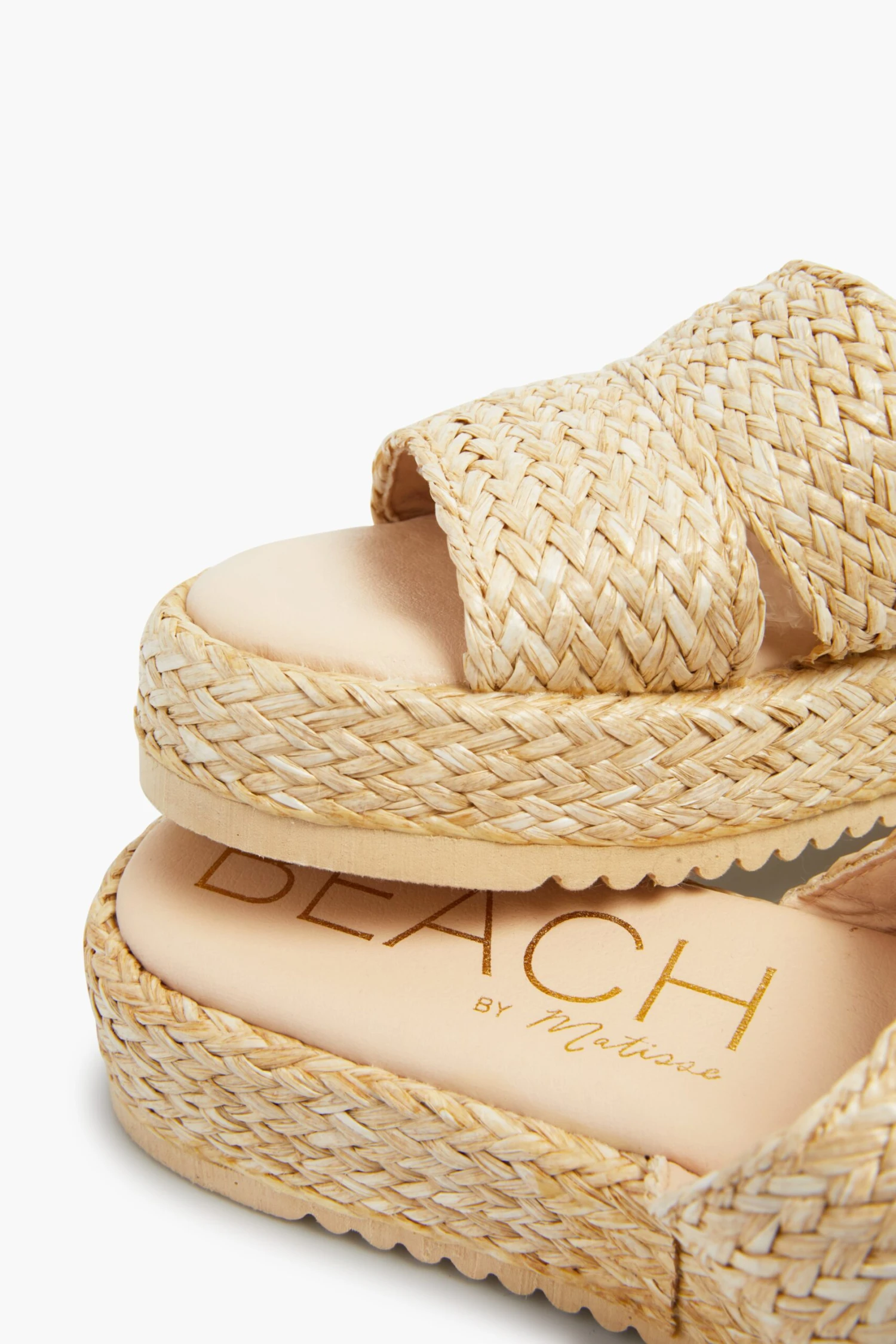 - Material: Raffia (upper), Synthetic (lining, sole)