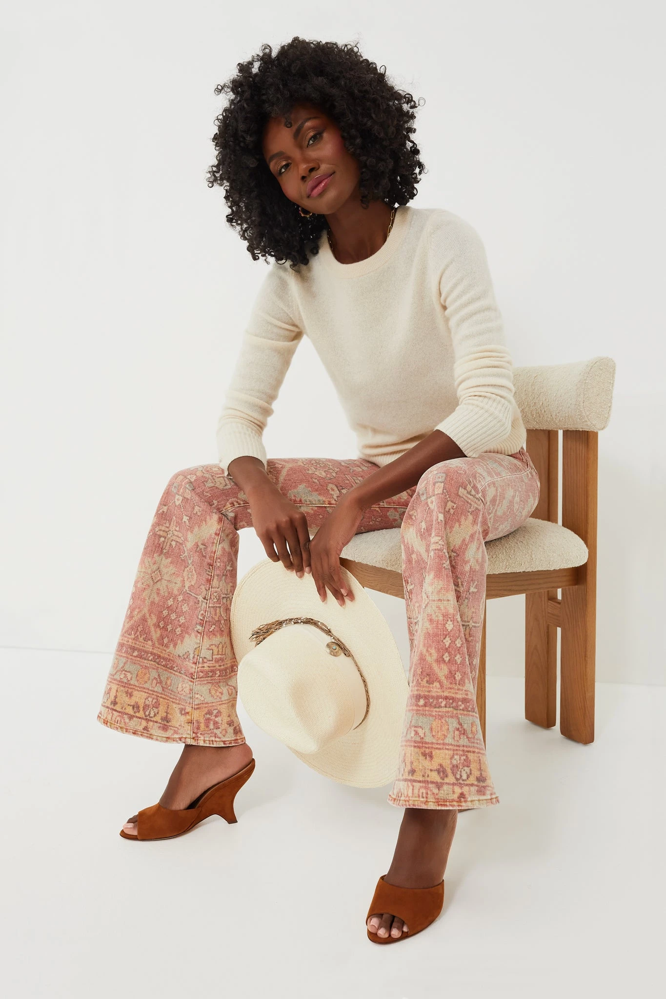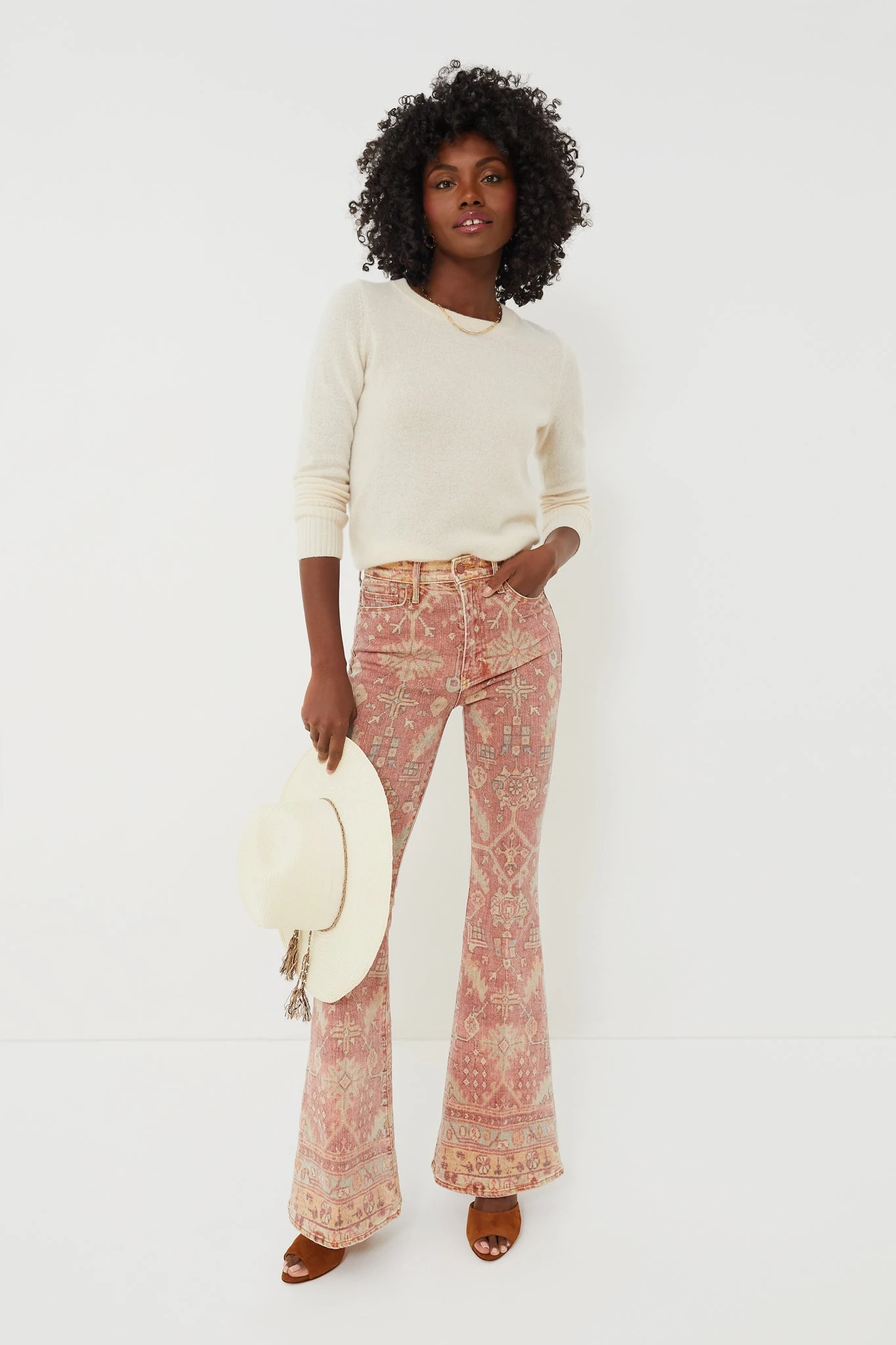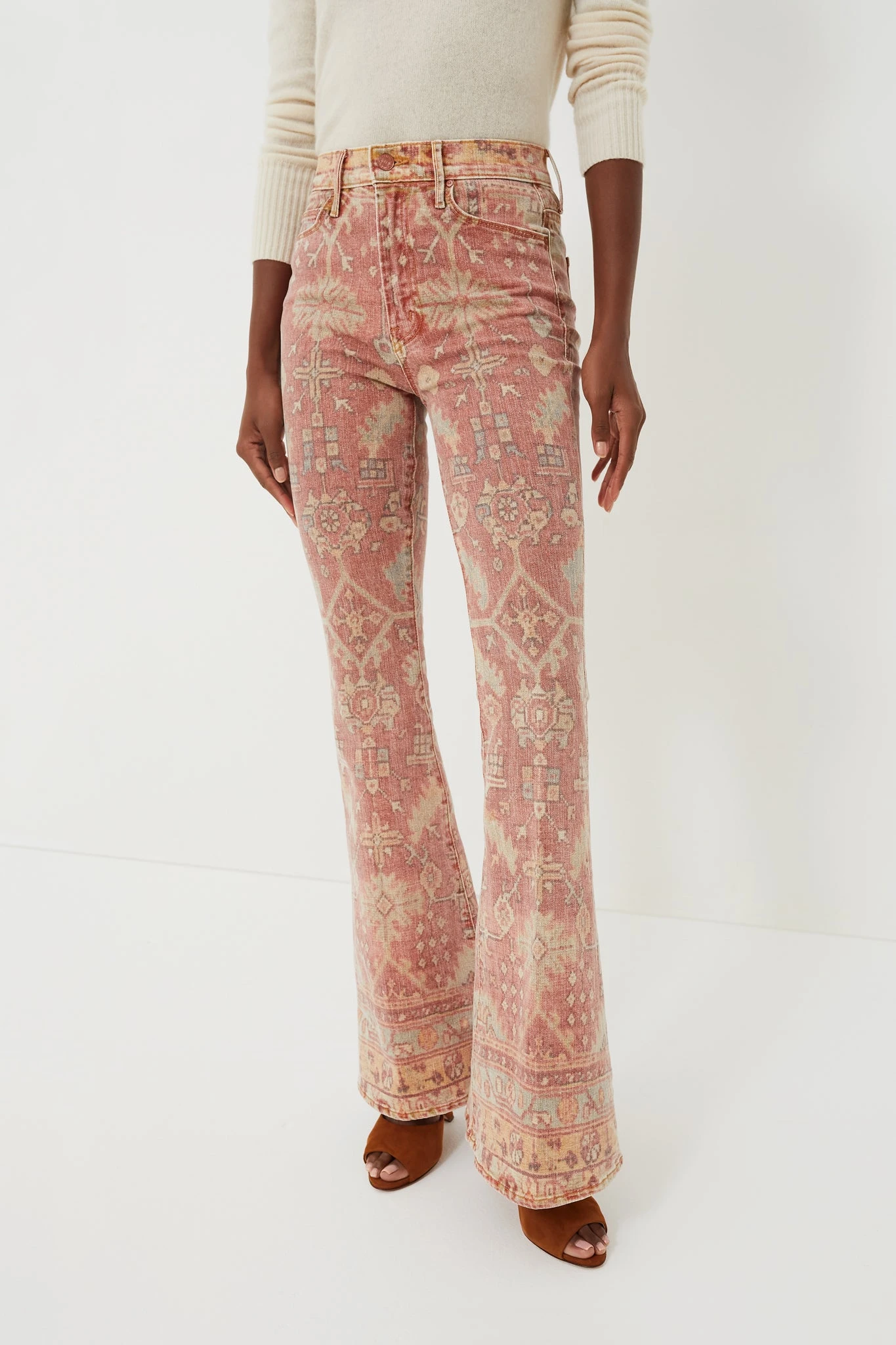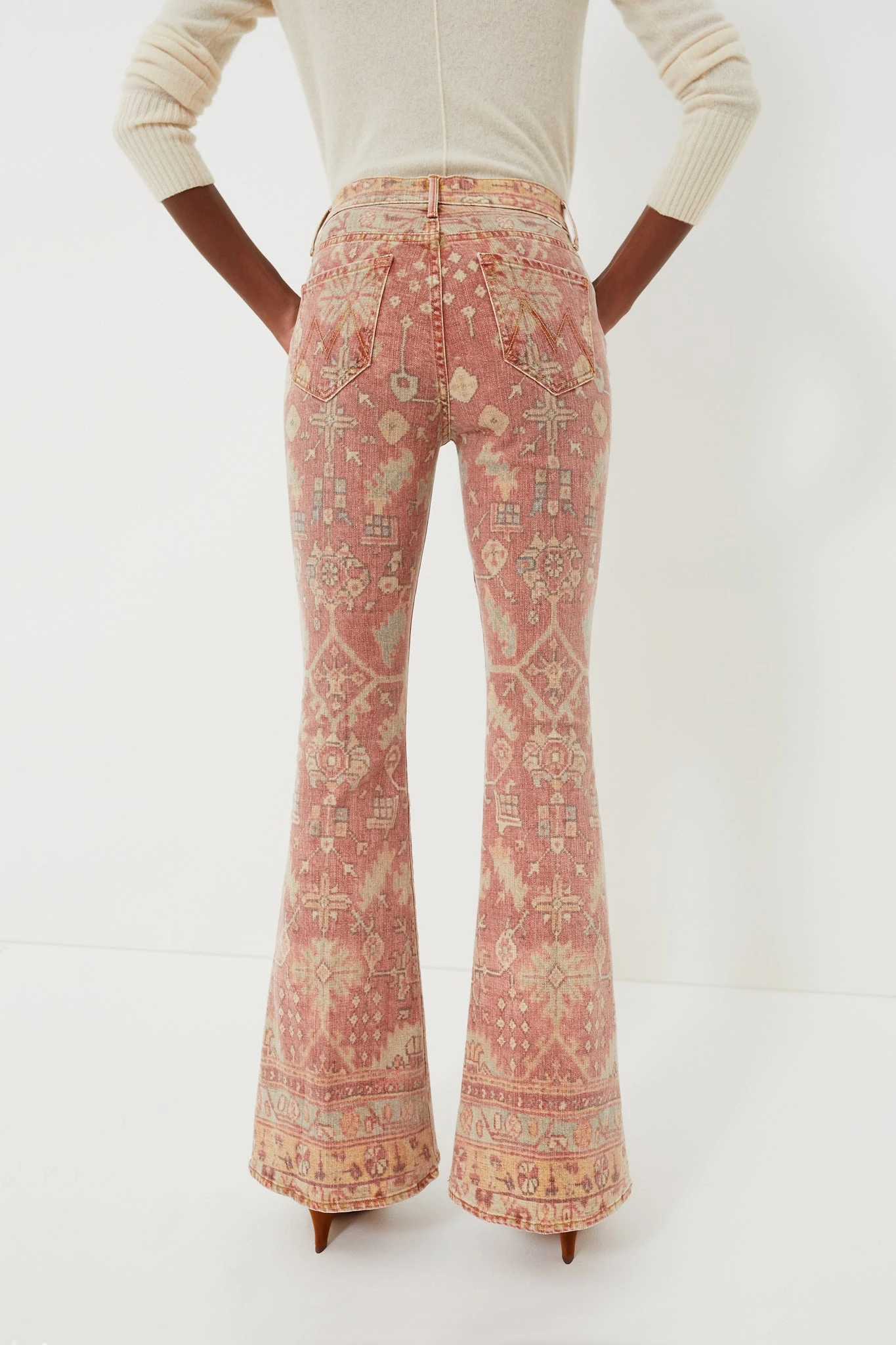The Rug Burn The Super Cruiser by MOTHER are the statement pants we have all been searching for. With a flattering high rise and flare silhouette, these jeans are complete with a faded Moroccan rug print in soft shades of salmon, yellow, and mint green. Pair with a plain sweater and boots for an eye-catching all-day look.Â