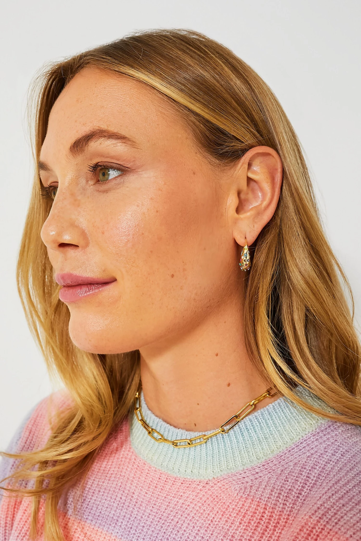 The Multi Evelyn Hoops have personality we cannot ignore! Kaleidoscopic multicolor inset crystals accentuate the sleek attitude of these effortless gold earrings and add pops of whimsy. Easily style with a white button-down and denim to elevate your desk to drinks look, or pair with a cocktail dress and heels for the perfect finishing touch.Â