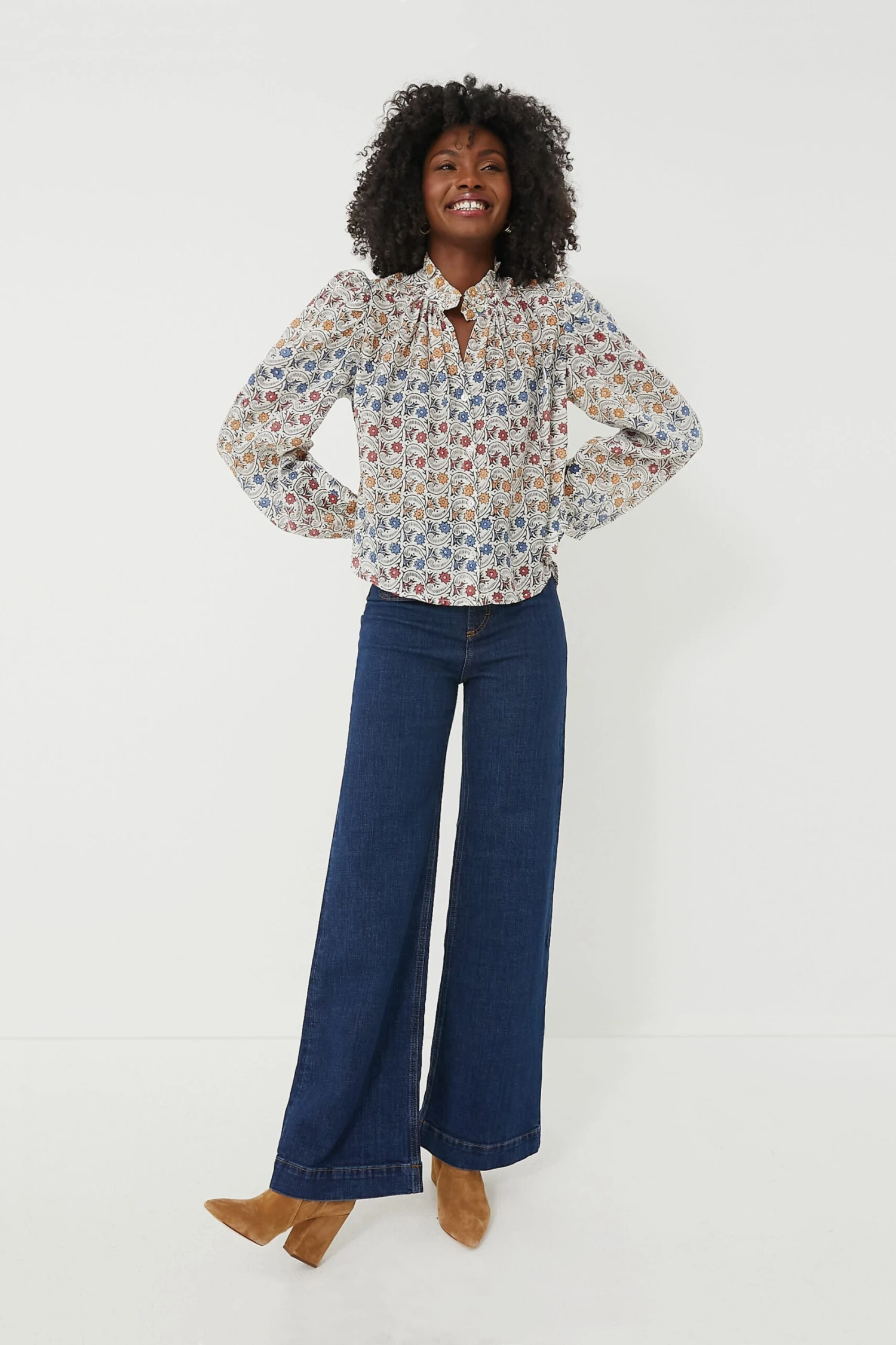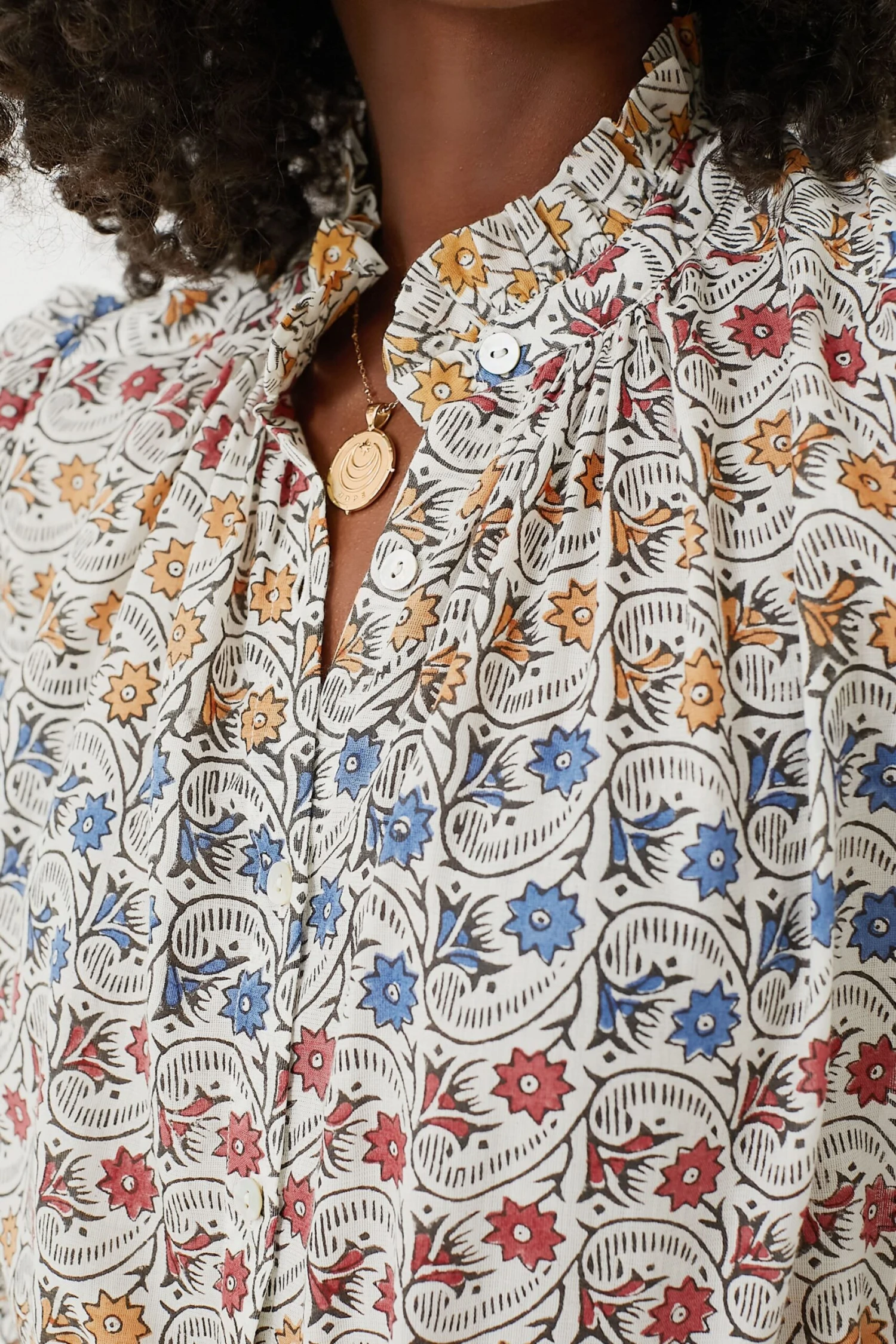 Blooming with rich hues and hand-block printed flowers, the charming Multi Wave Daisy Annabel Shirt is a staple in any season. Finishing touches include a ruffled stand collar, subtle puff shoulders, mother of pearl buttons down the placket, and a floaty fit that all come together to create an understated but elegant top. Made of lightweight and breathable tencel lyocell, this style is beautifully paired with trousers for an elevated ensemble or tried-and-true denim for a retro-inspired boho-chic look.