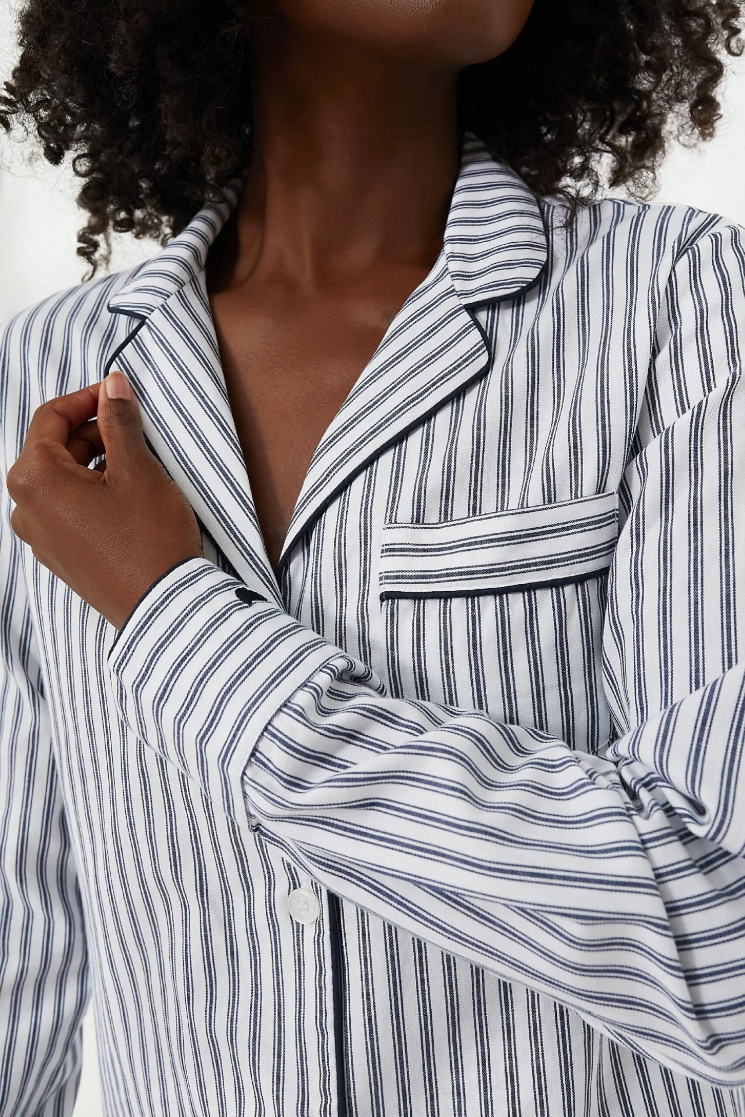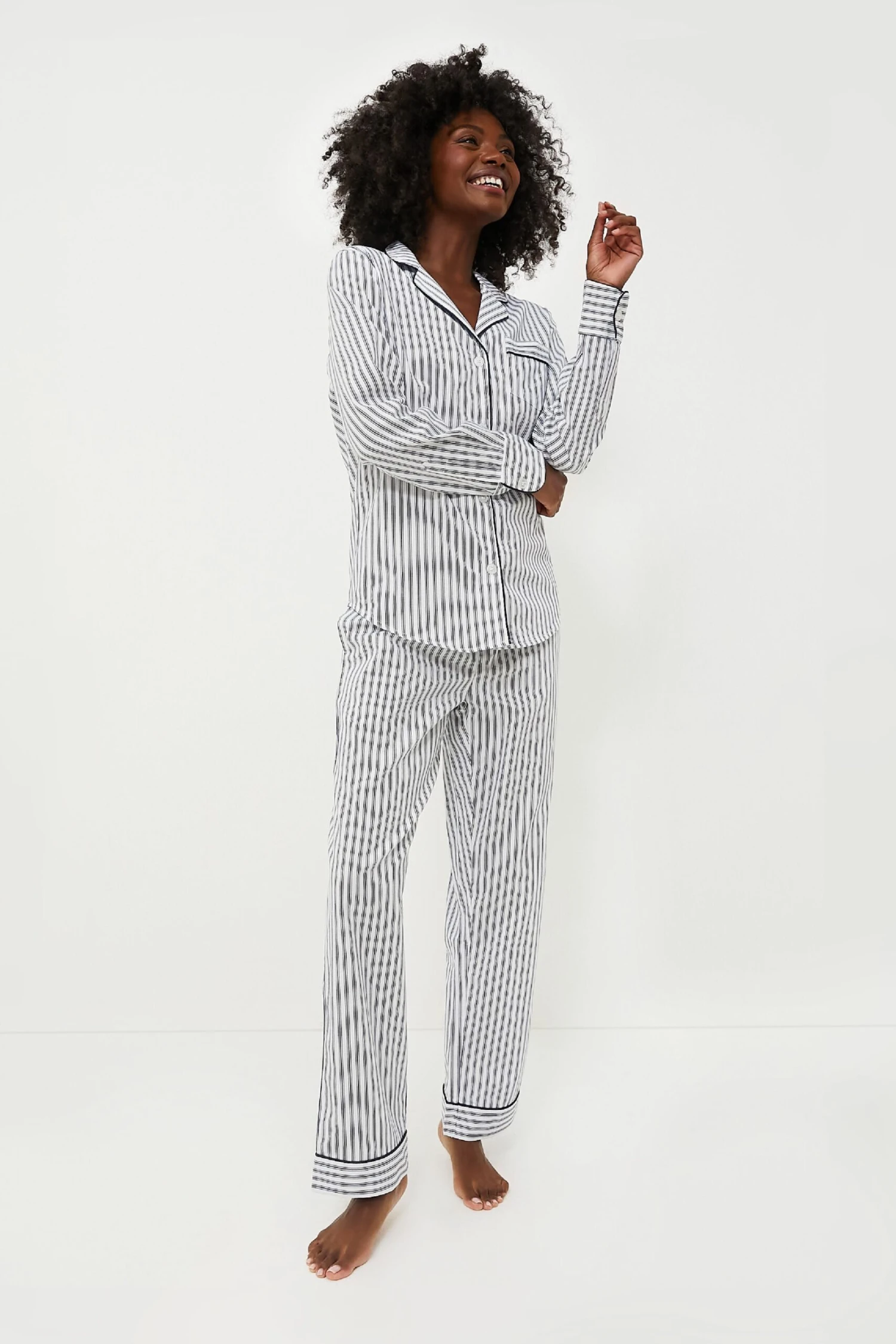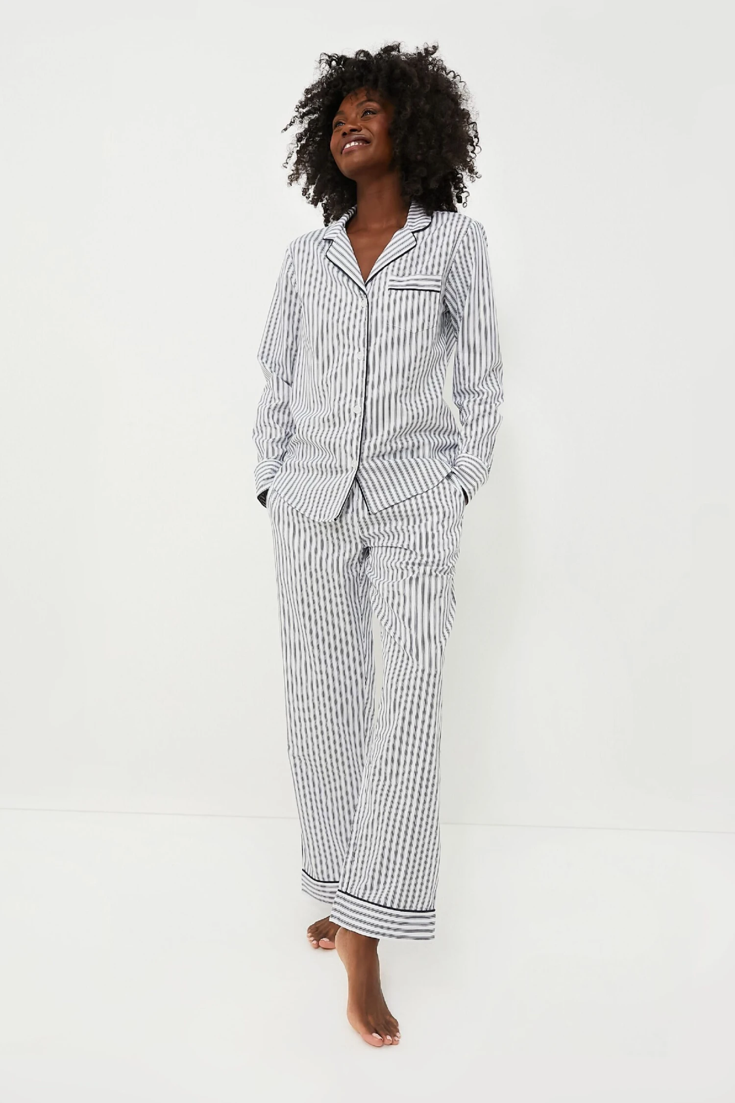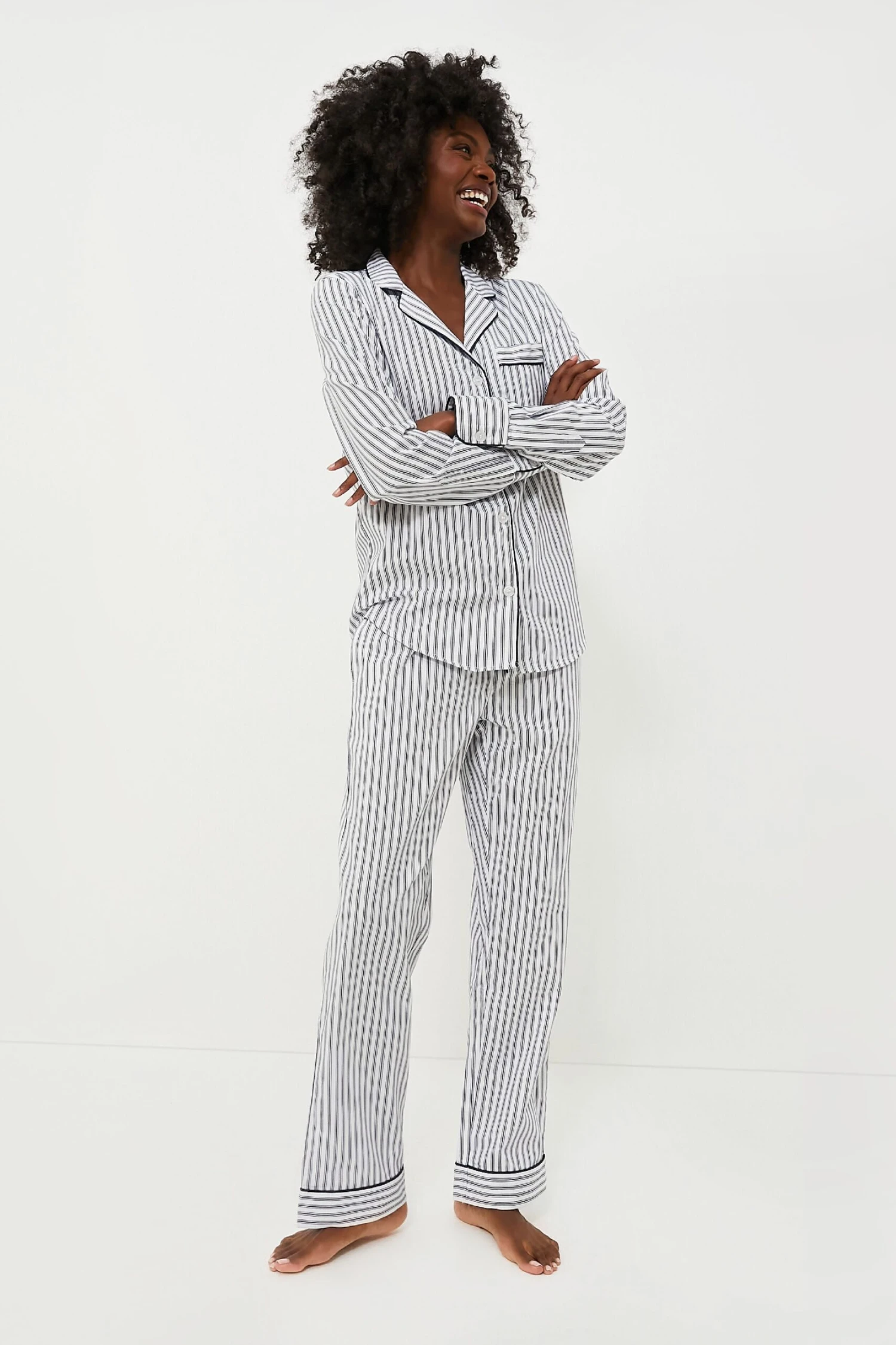 The Navy French Ticking Pajama Set is made from the finest quality cotton in a classic print. Yarn-dyed to prevent fading and brushed for added softness, we love how these get cozier with every wash. Add slippers and a robe for relaxing mornings spent with a cup of coffee in hand!