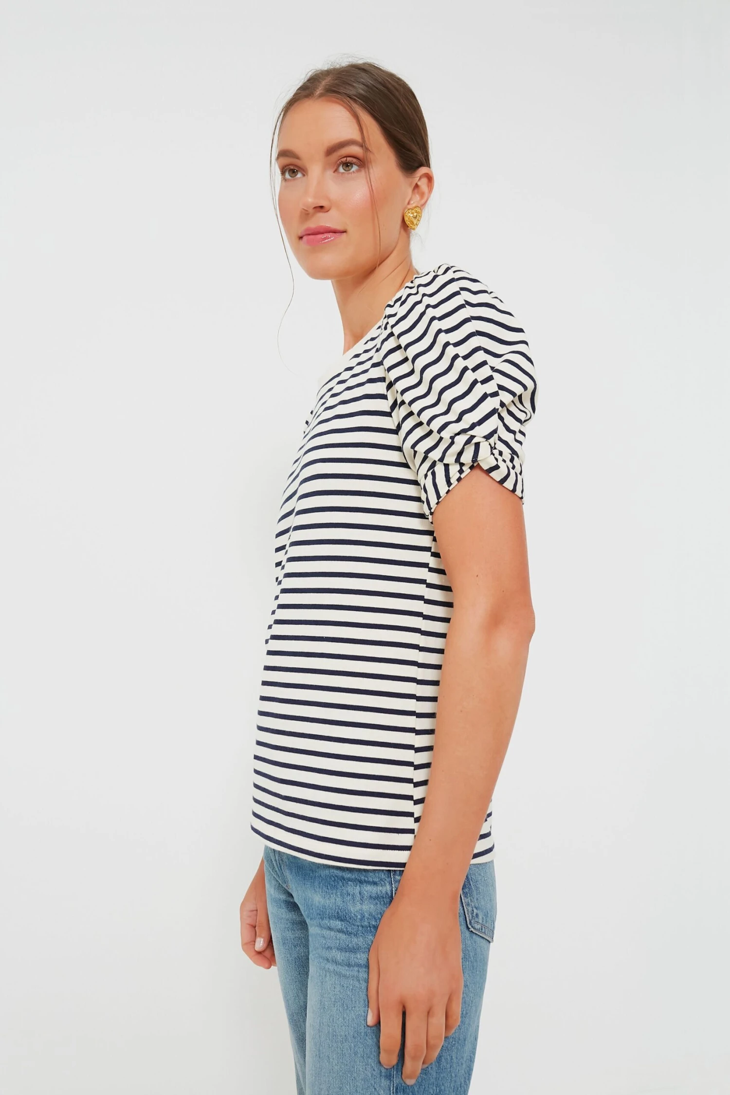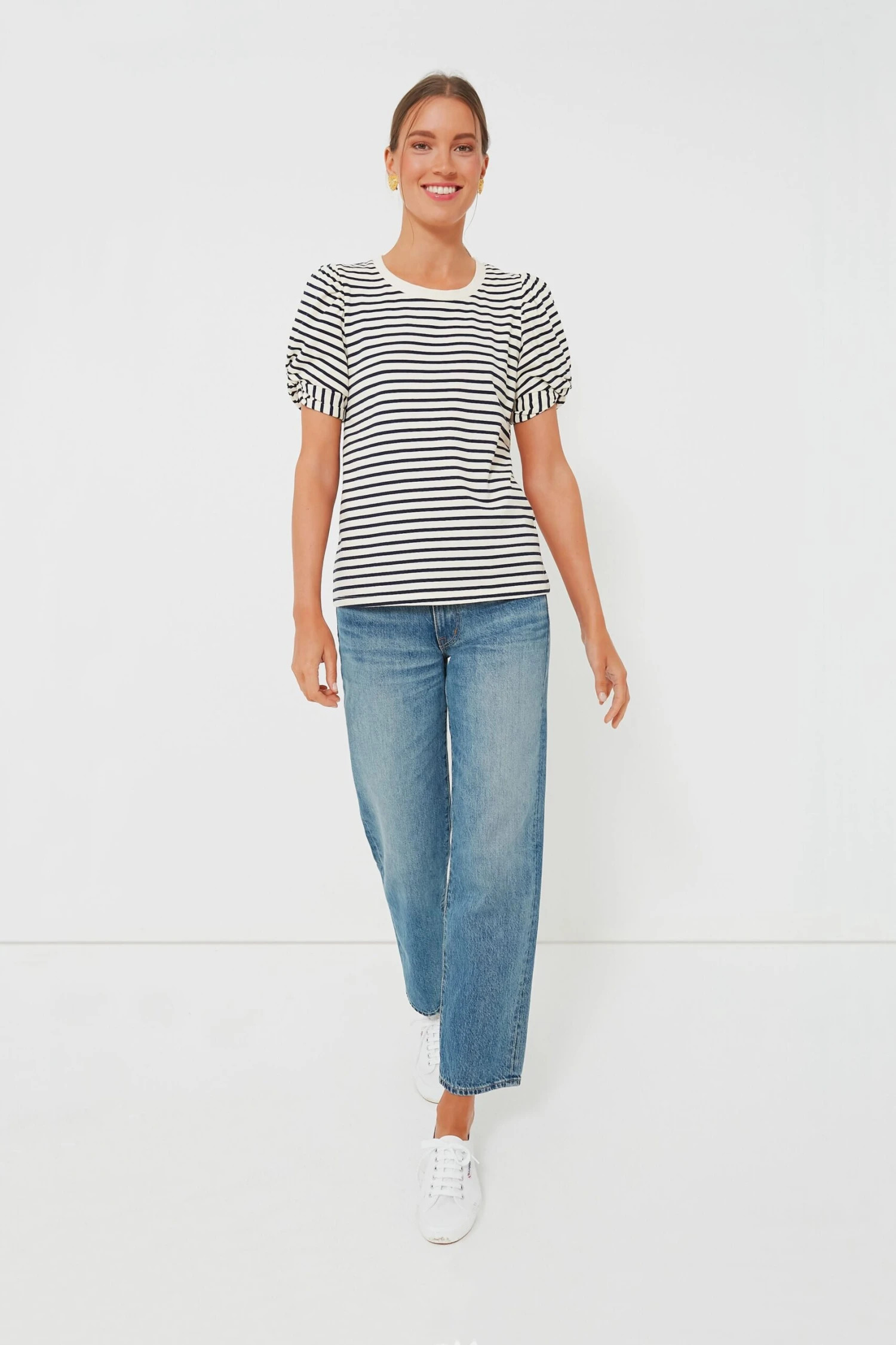 Basic yet fun, the Navy Striped Vesty Puff Short Sleeve Crewneck is the casual cool number you need to update your wardrobe. Featuring slightly puffed sleeves with a knot tie detail and a loose fit, you’ll constantly reach for this piece time and time again. From errands to lunch, we are pairing this with our go-to denim and a tote!