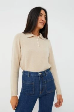 A neutral style staple, the Oatmeal Alice Polo Sweater is the perfect starting point for a great outfit. Made from high quality and super-soft cashmere, this cozy knit features a spread collar that brings a bit of extra sophistication, as well as a partial front placket and a comfortable relaxed fit. Pair with classic denim, ballet flats, and gold jewelry for a timelessly chic look.