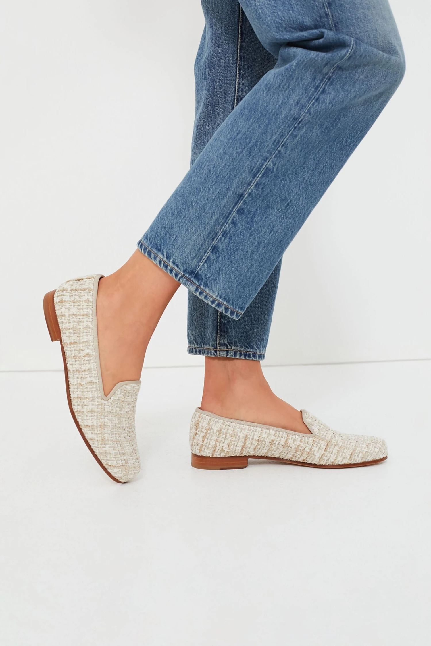 - Material: Tweed (upper), Grosgrain Ribbon (trim), Leather (lining and outsole)