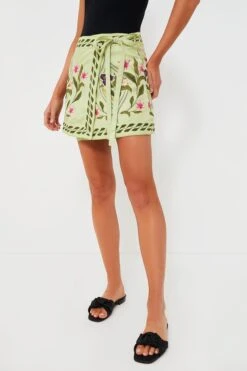Soak up the sun in the Pacifico Luna Mini Pareo, a chic mini with a delicate tie fastening at the waist. A sage green background decorated with a vibrant floral overlay, this look can be worn over a bathing suit as a coverup, or with a tank top and sandals to post-beach drinks.Â