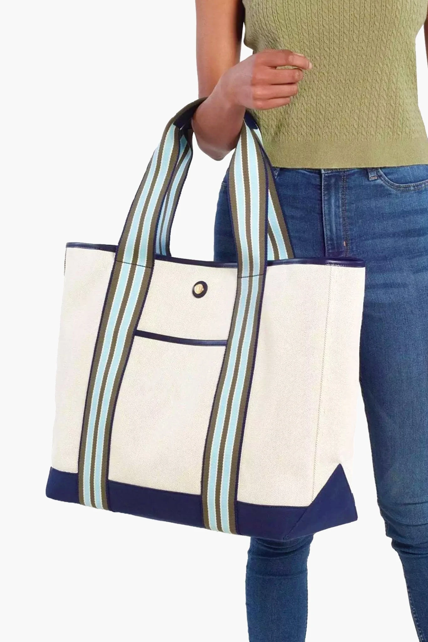 Vibrant, lightweight, and practical, this bag has the space and strength to ferry all of your belongings. Its dependable interior features zippered pockets and a water-resistant lining made from 5 post-consumer recycled water bottles, keeping items secure, dry, and (if the seaside is calling) sand-free. Vivid stripes add a pop of joy, and leather accents let this spacious companion do the heavy lifting while you lounge. It’s like a hammock for your essentials.