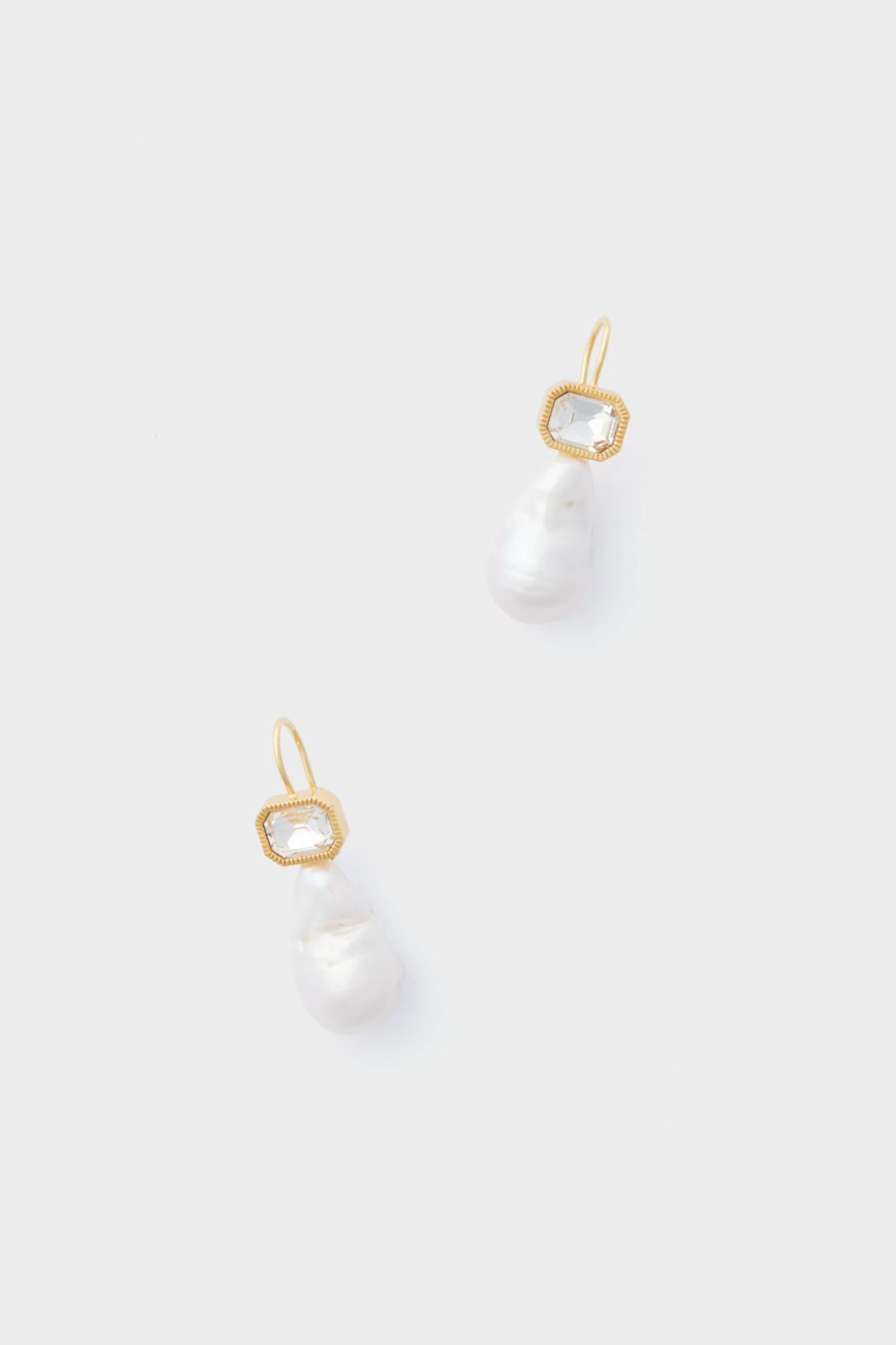 The Pearl and Crystal Dangle Earrings are an elegant statement. With a square stone encased in gold and a chunky freshwater pearl drop, this style has movement and dimension that will turn heads and elevate your wardrobe. An easy everyday piece, you can wear this with everything from denim and a blouse to a formal maxi dress. Â