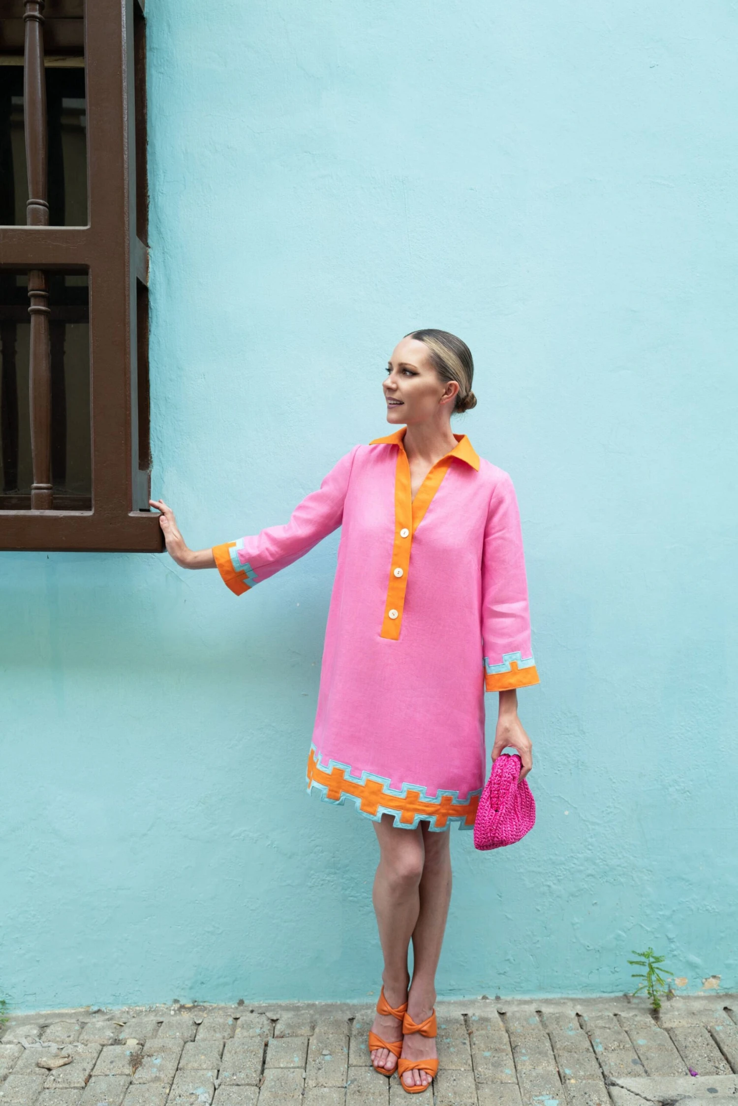 Our best-selling Collier Dress was updated with a beautiful geometric placed trim that is inspired by the old school glamour of scallop trim pagoda-style umbrellas. Crafted from 100% linen, this easy breezy mini flatters and flows in all the right places.Â