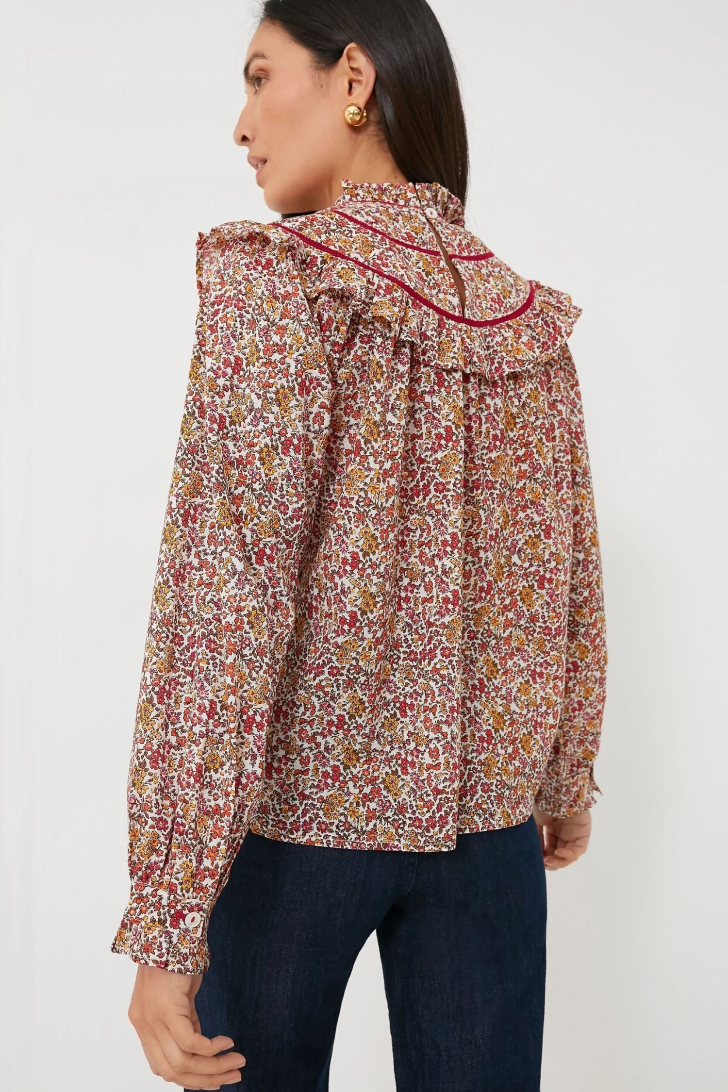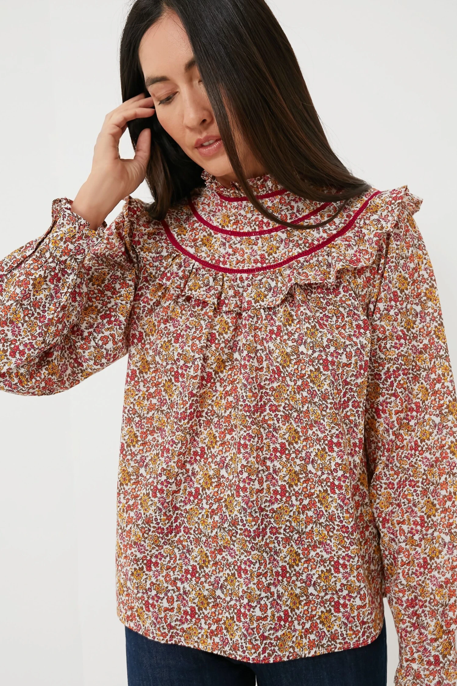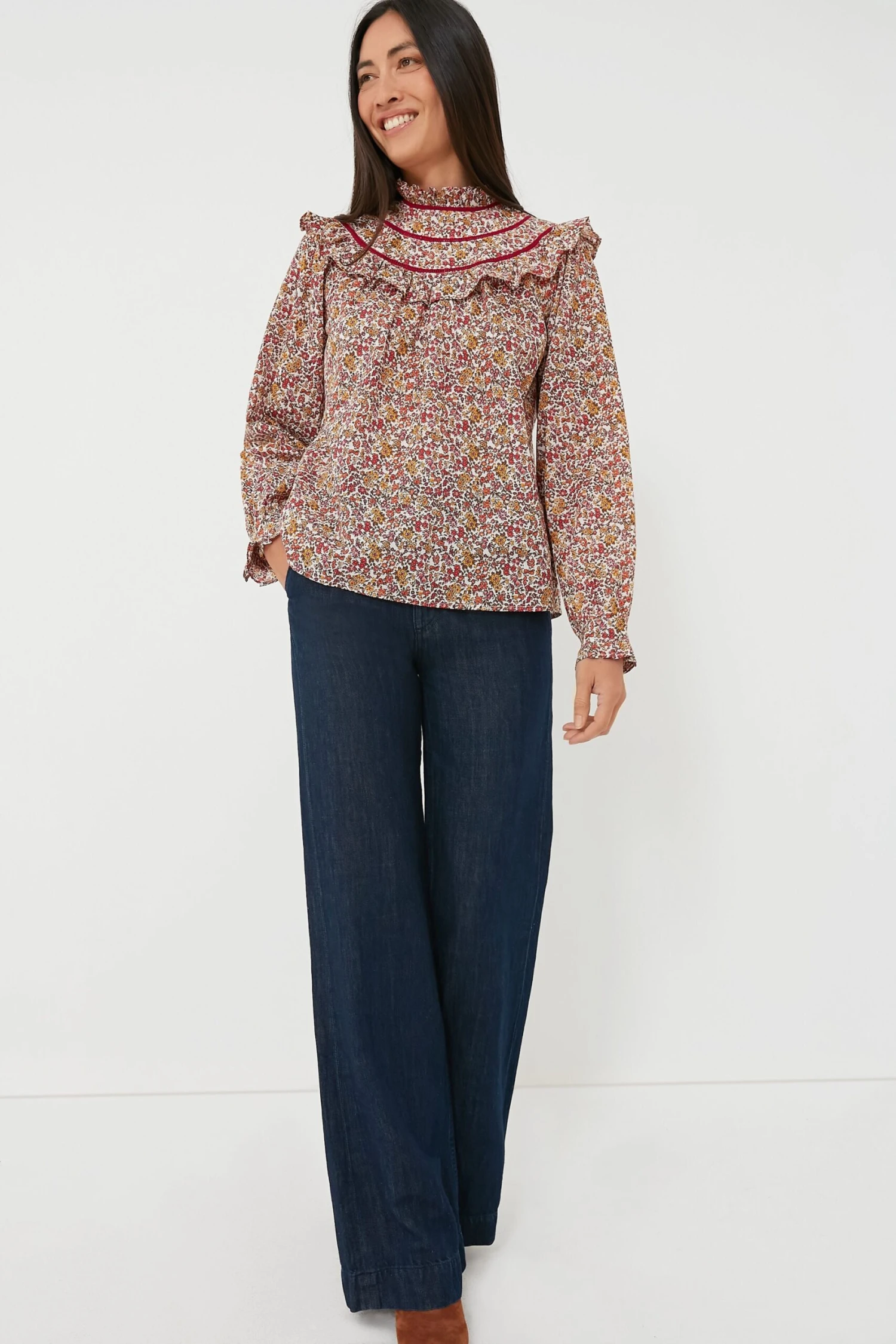 Darling ditsy florals meet an autumnal color palette to create the Pink Grenada Top — a stunning transitional silhouette that should be in your closet this season. Complete with feminine details like a ruffled stand collar and blouson sleeves, as well as an interesting bibbed neckline that catches the eye with its contrast trim, this style is boho-chic at its very best. Pair with dark denim and gold jewelry for brunch with your besties, school pick-up, or a stroll in the park.