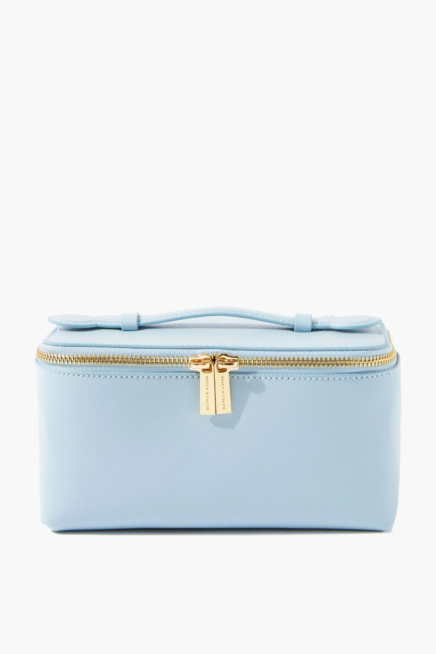 With a little more structure than your typical cosmetic case, the Saffiano Small Vanity is able to hold your beauty essentials and toiletries in style. Whether sitting on your bathroom counter or squeezing into your travel bag, this perfectly-sized holder features a top handle, a zippered closure, and a durable leather construction in an ice blue hue you are sure to love. Great as a gift or a treat yourself purchase, this thing is about to come along with you on weekend getaways and longer trips alike.Â