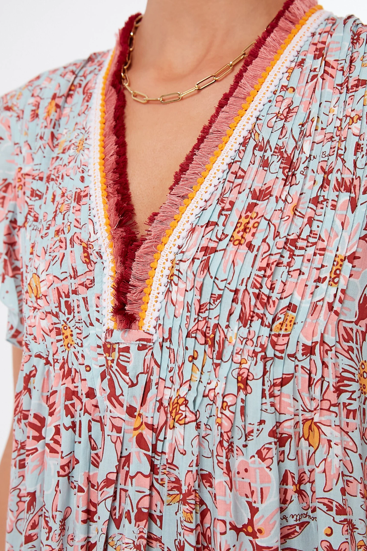 - Contrast fringe at neckline