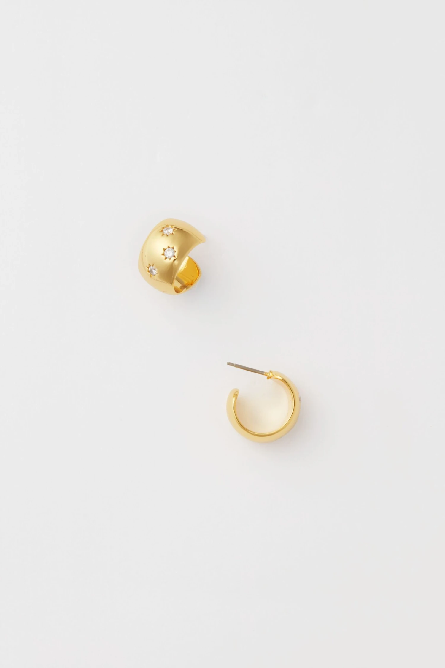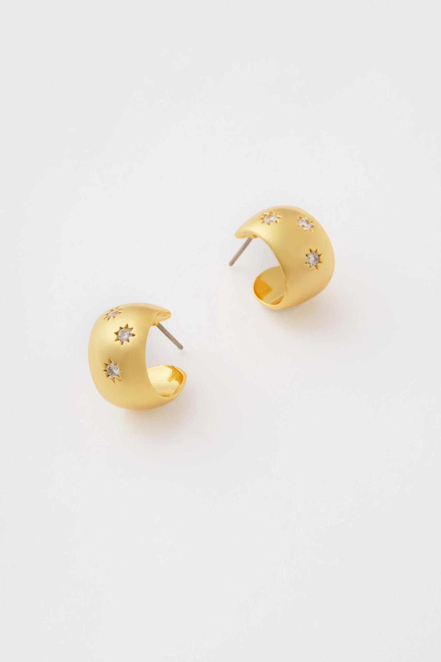 Whimsical and charming, the Starry Night Gold Earrings are simply the best outfit finisher! A thick huggie band is decorated with star embellishments for a playful take on a classic silhouette. Add a little shine and flair to your look with these beauties, from beach to street these little hoops will effortlessly complete your look!