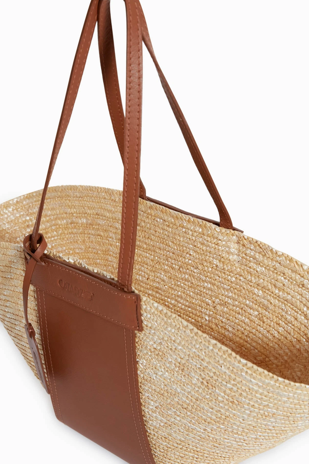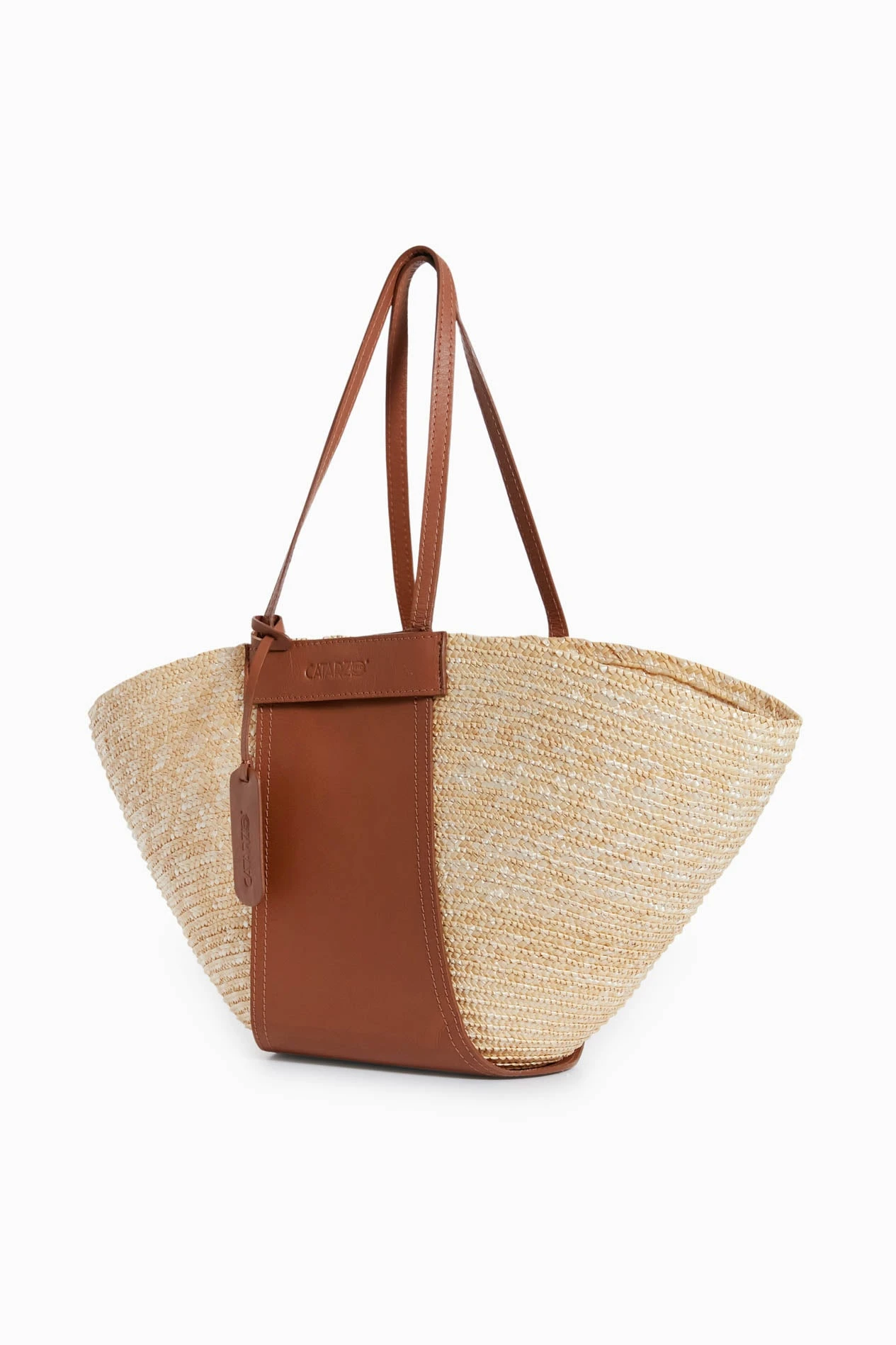 Our new go-to bag to complete any outfit when the sun is out, the Tan Cristina Tote is made from woven straw with cognac leather details. An open top allows for easy access to your essentials when you need them, while subtle touches like a leather hangtag at the handle base and an embossed logo bring hints of luxury to a casual beachy style. Tie a silk scarf to one handle for a pop of color, then pair with a breezy caftans to chill by the pool or with white denim to meet the girls for happy hour.