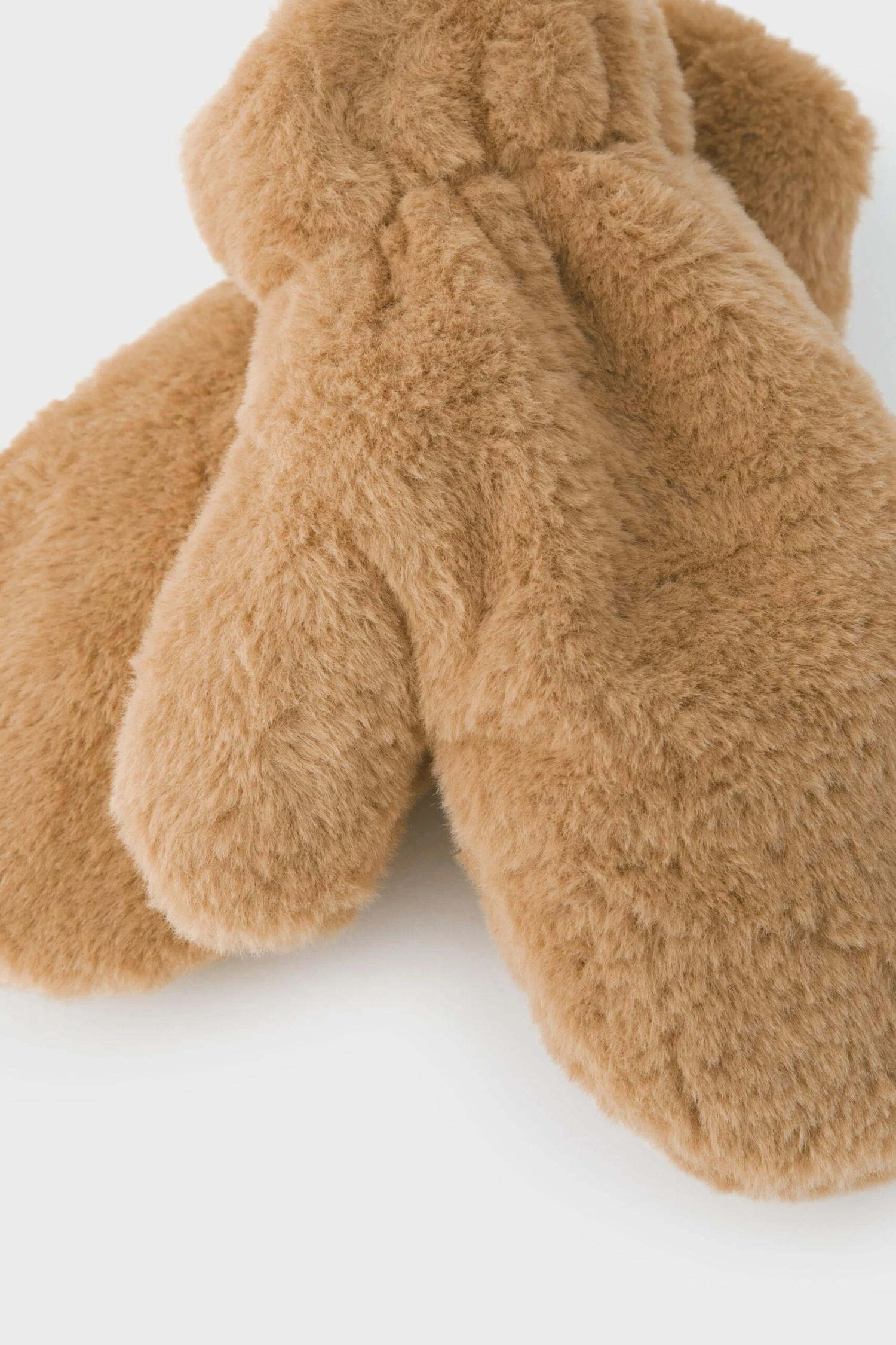 With a soft exterior and interior lining, these mittens will keep your fingers warm all winter. The fuzzy fabric and taupe coloring add a touch of coziness, making these the perfect addition to any warm outfit. Pair with a cream sweater and jeans to go holiday shopping, or with a double breasted coat and boots for snowy walk.Â