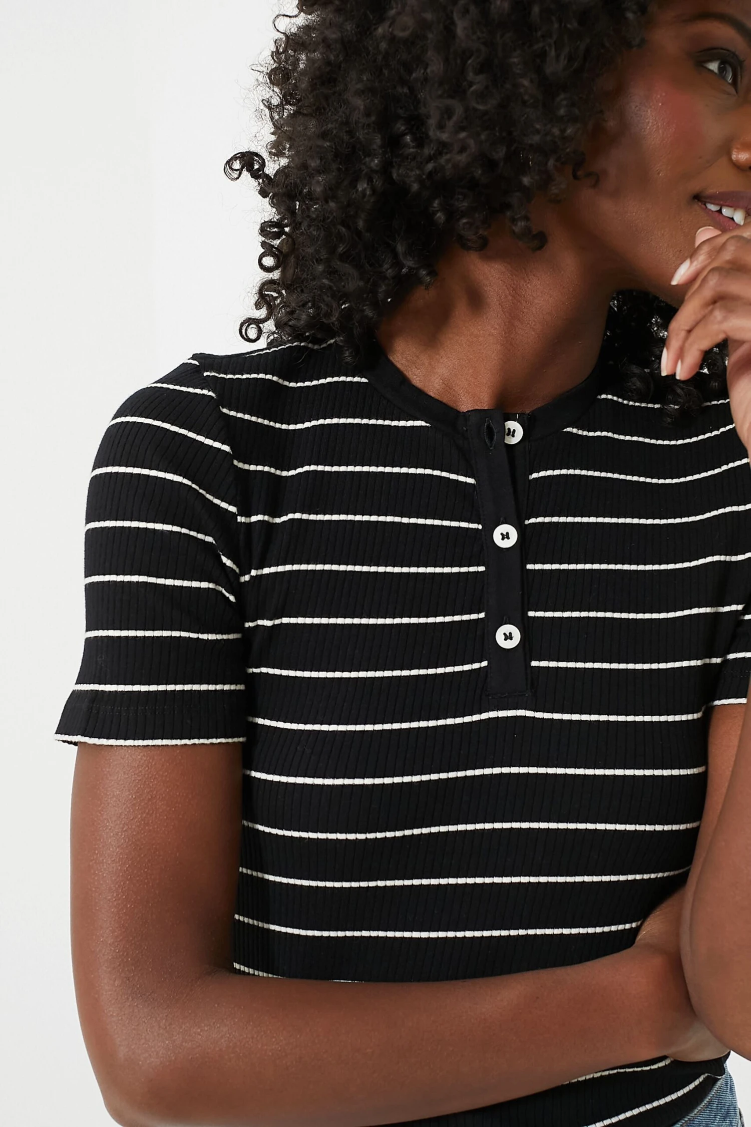 The The Black and Cream Genie top is a perfect closet staple. With a fined-striped pattern and ribbed fabric, this comfortable short-sleeve shirt is marvelous as a layer or to shine on its own. Soft, comfortable, this is ideal for all-day wear. Pair with skirts, denim, shorts- this is truly a style you will be reaching for over and over again!Â