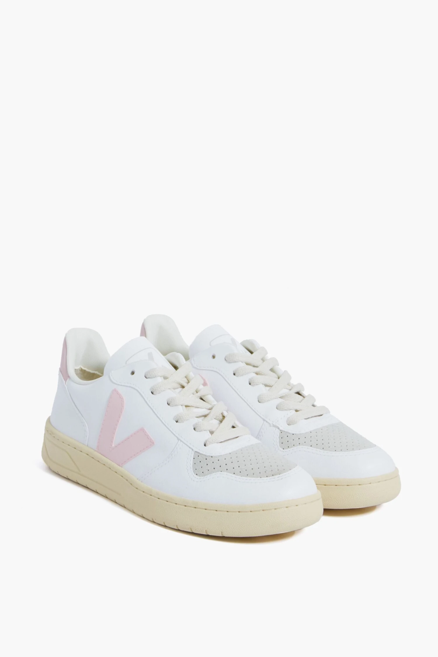 The White Petale V-10 Sneakers feature a pale pink logo patch that has us dreaming of springtime, and a darker mesh toe panel for some contrast, making them a cool and wearable update to the classic white sneaker. This chic pair of tonal shoes is ultra-comfortable with a padded collar and a thick flat sole, so you will reach for these to complete nearly any outfit, from mini dresses to denim to joggers. We love to wear them everywhere from quick coffee runs to long days of errands.