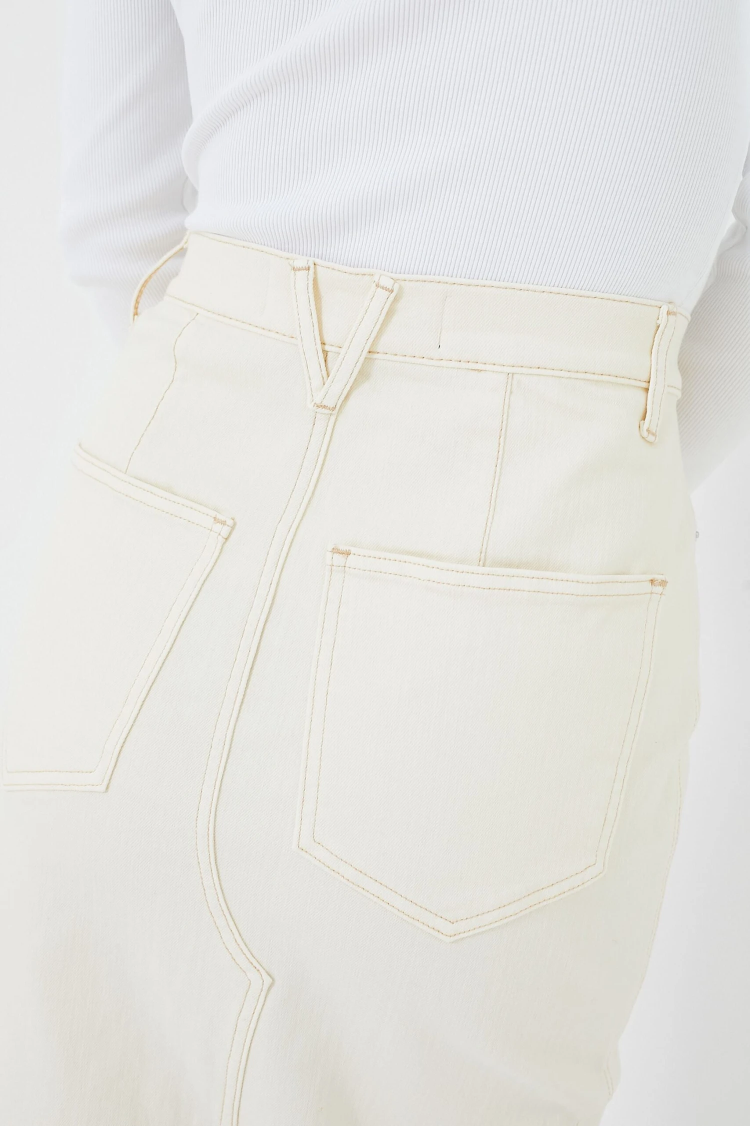 A great denim skirt is a cornerstone of every wardrobe. Introducing the Breves Skirt, expertly tailored from premium stretch ecru denim, with a flattering high-waist midi silhouette, a front slit and classic 5-pocket styling. Dress it up or down—or try it with a denim vest for a new take on double denim.