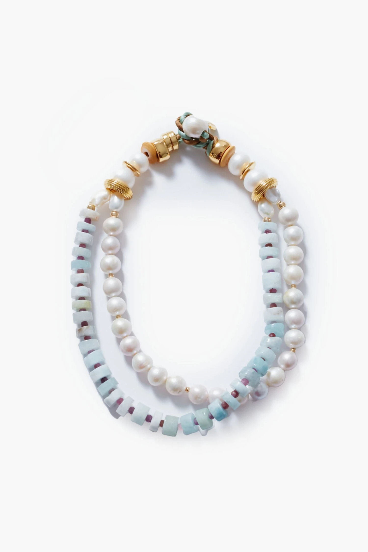 - Material: Freshwater Pearl, Aquamarine, Sapphire, Gold-Plated Beads, Silk