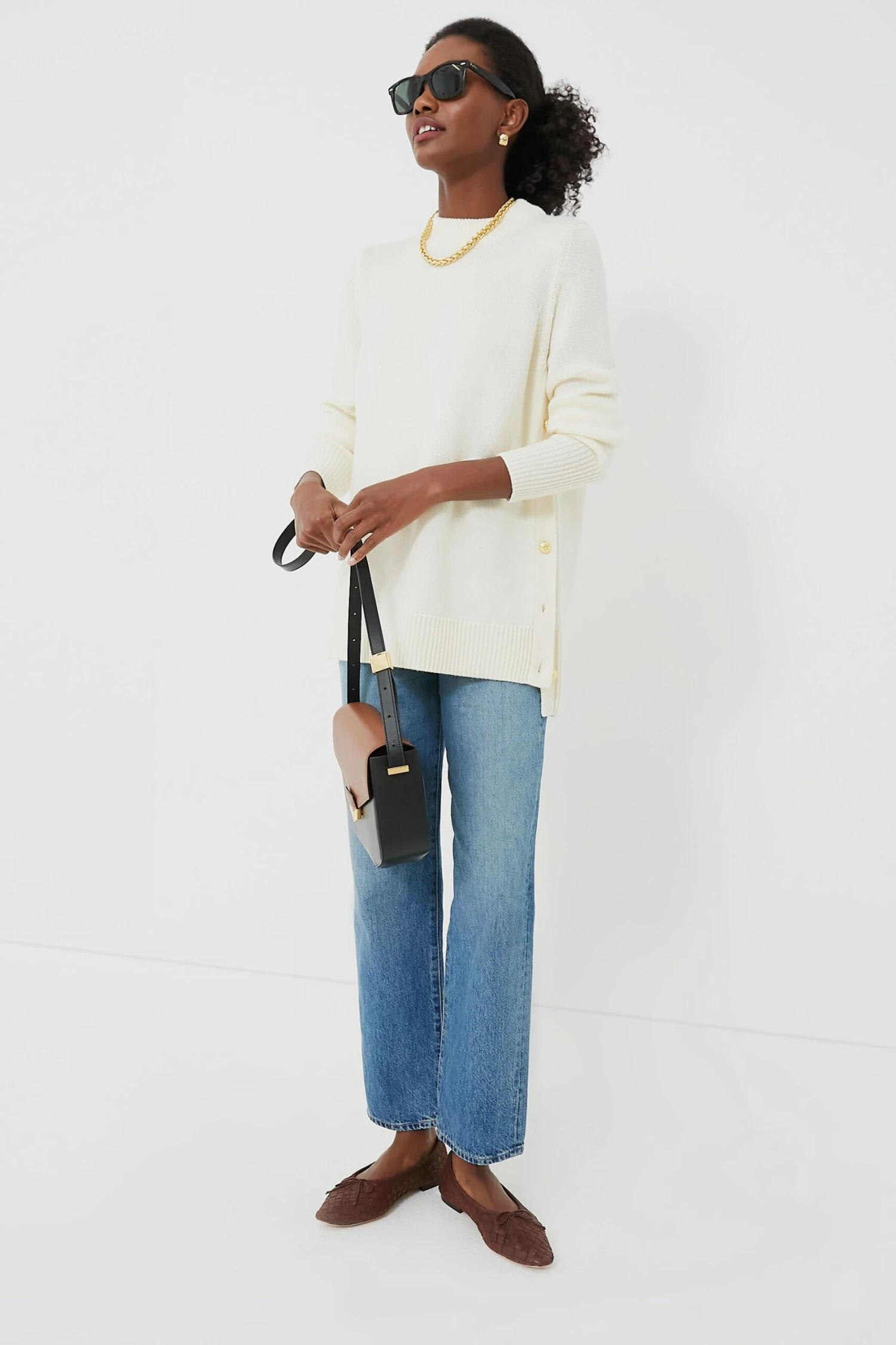 An update to the classic crewneck style, the Bexley Sweater was crafted for layering over tees and button-downs on crisp days, or draping over your shoulders when the temperature heats up. The perfect creamy neutral hue, a medium-weight, and the unique details like gold side buttons and an adjustable high-low hem have us grabbing for this knit day after day.